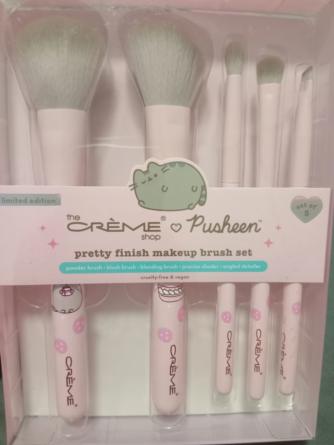 This is a limited edition set of 5 makeup brushes from The Crème Shop featuring Pusheen designs. The set includes a powder brush, blush brush, blending brush, precise shader, and angled detailer. It's cruelty-free and vegan!