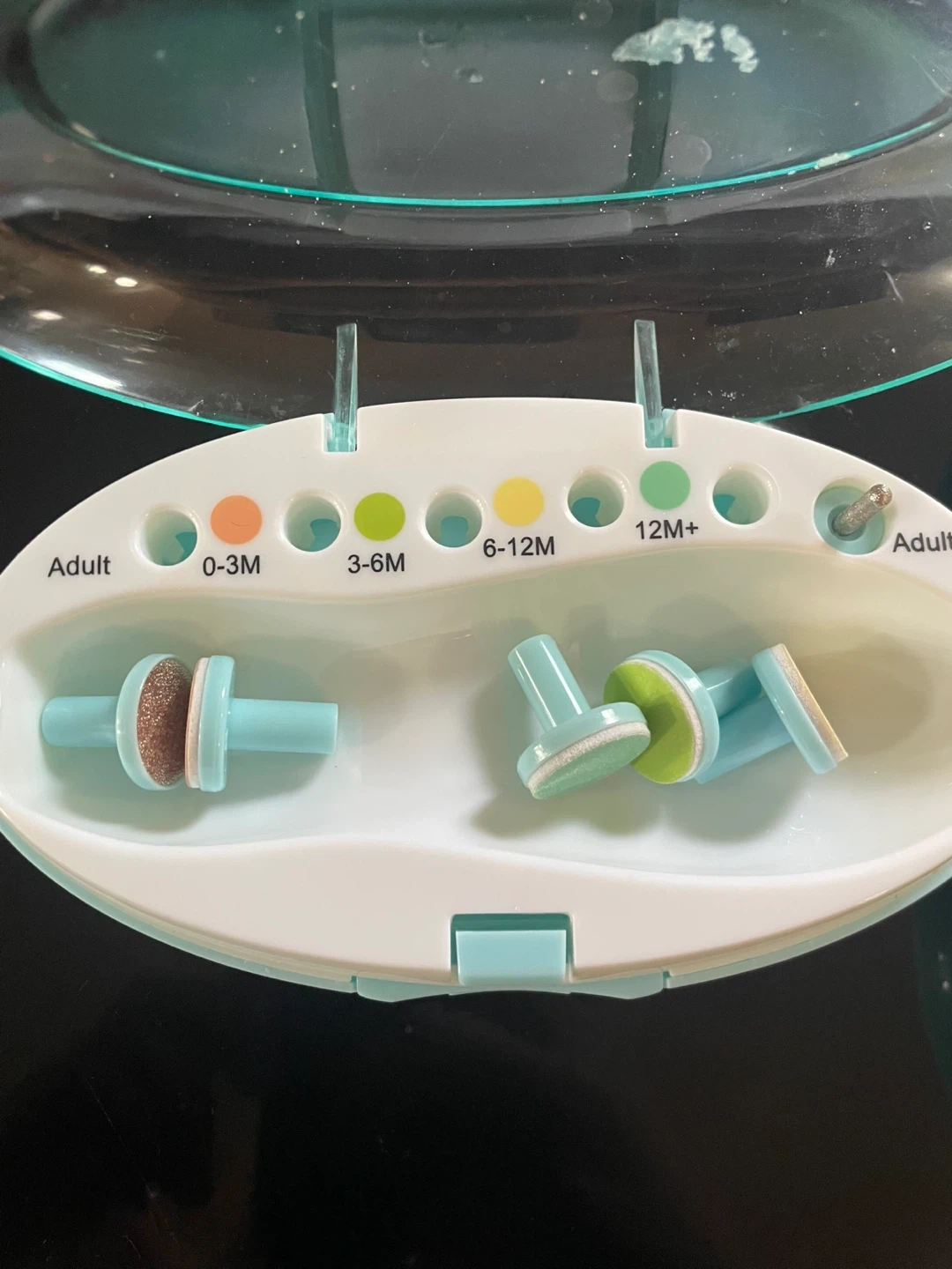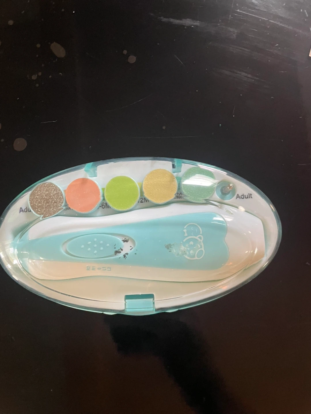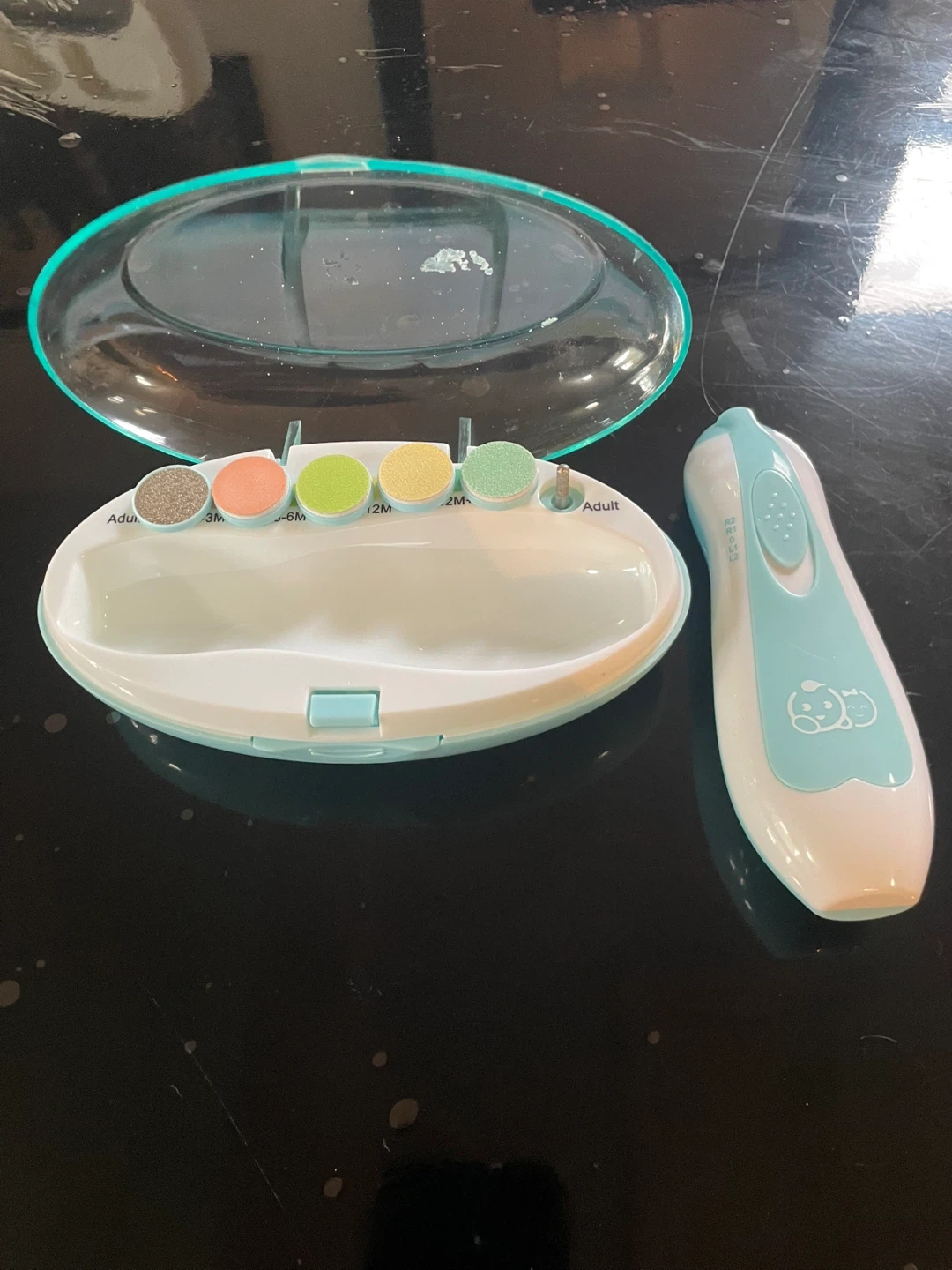 68Selling a baby electric nail file trimmer set. It comes with different filing heads for different ages, from 0-3 months to 12+ months and adult. Also includes a case for easy storage and portability. Used a couple of times includes box and manual. Comes with extra replacement pads and different types nail filing tools.