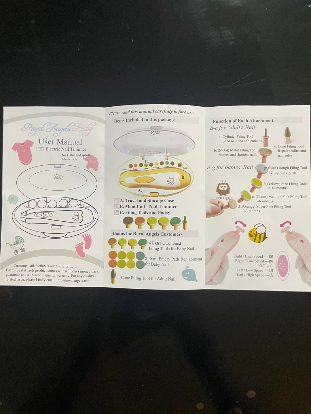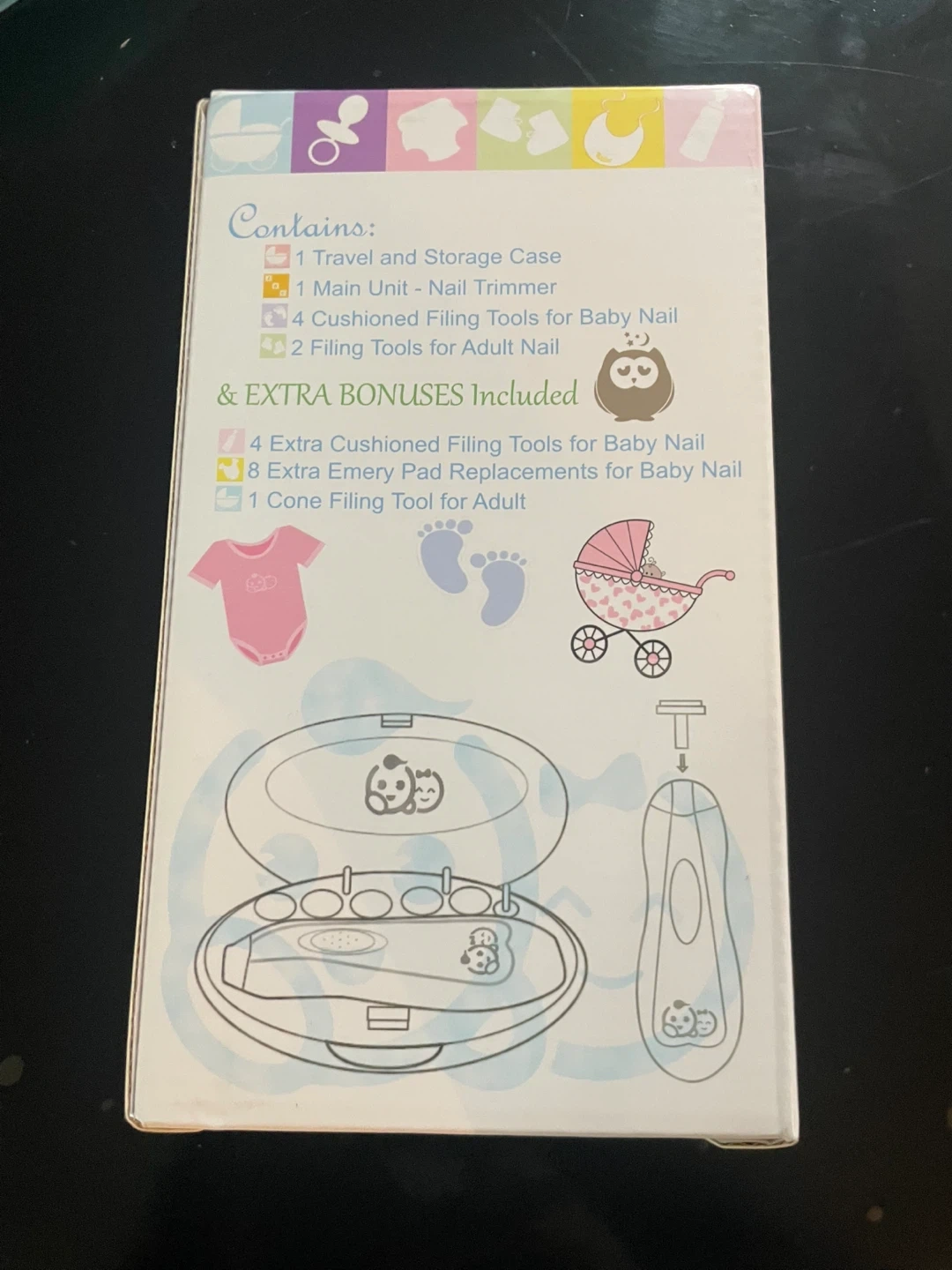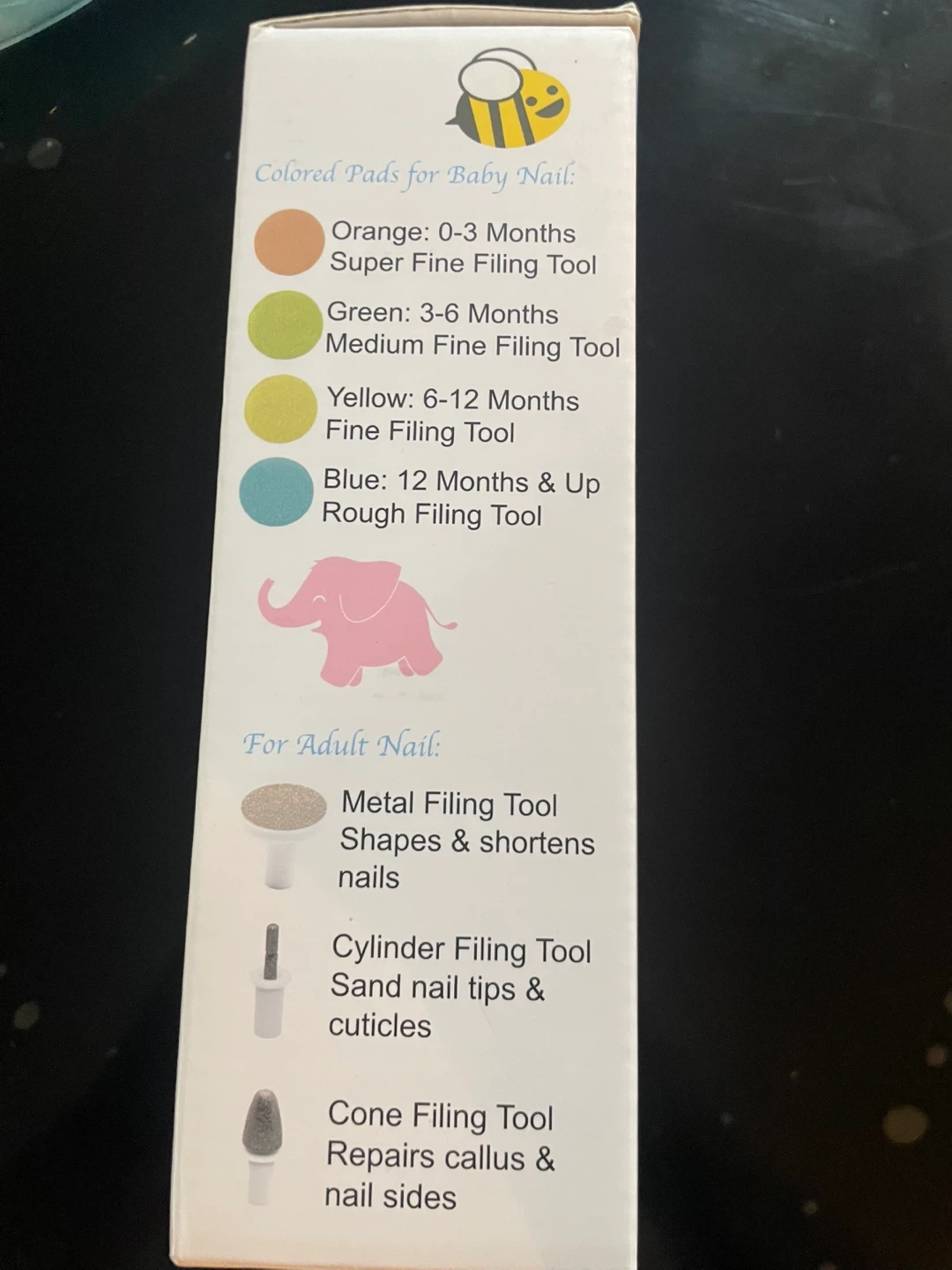 68Selling a baby electric nail file trimmer set. It comes with different filing heads for different ages, from 0-3 months to 12+ months and adult. Also includes a case for easy storage and portability. Used a couple of times includes box and manual. Comes with extra replacement pads and different types nail filing tools.