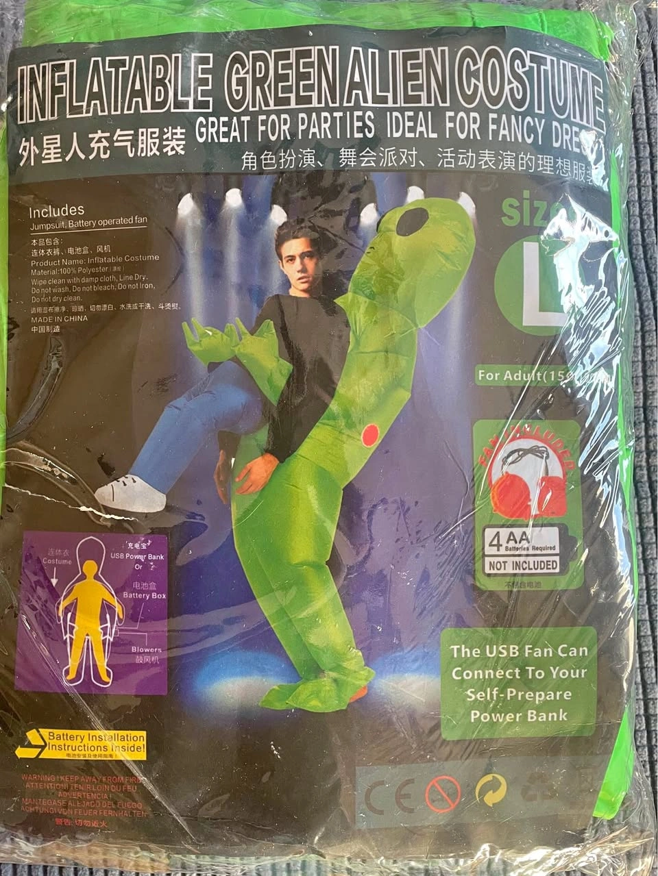 71This costume is new in the original packaging. Fan was tested and is working as it should. Will fit 5’5” to 6’3”. I have 2 of these available. Pick up in Chestermere. See my other ads for more Halloween items.