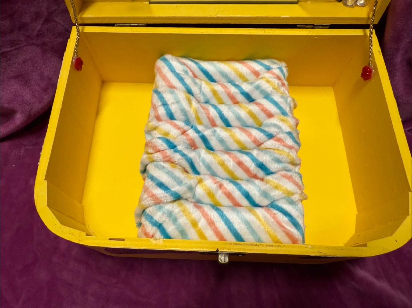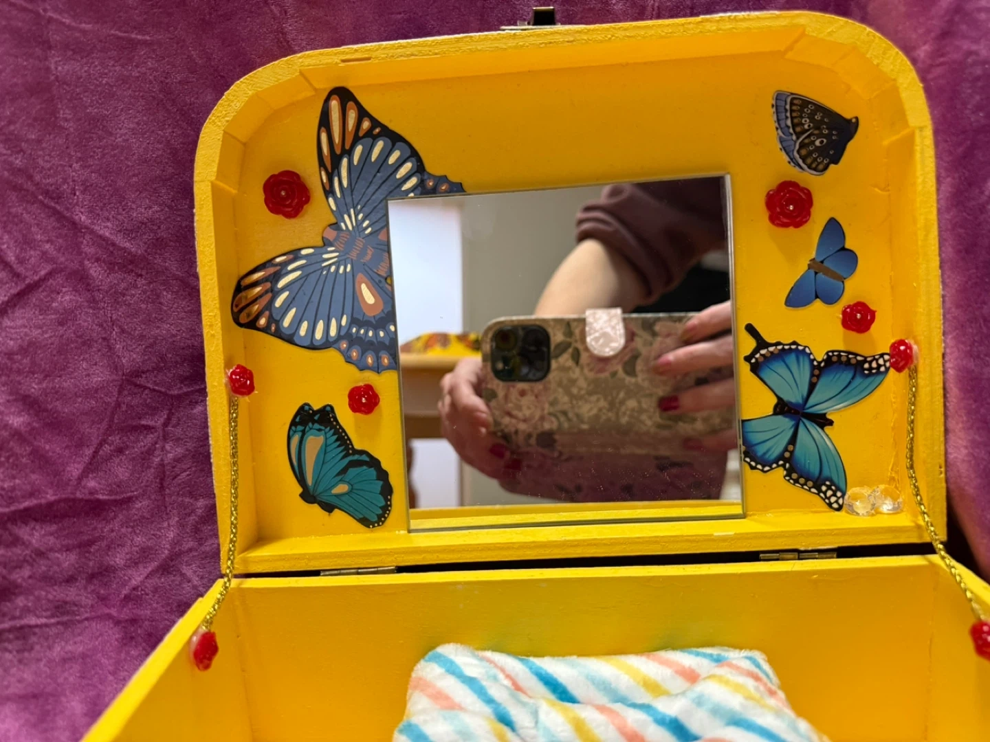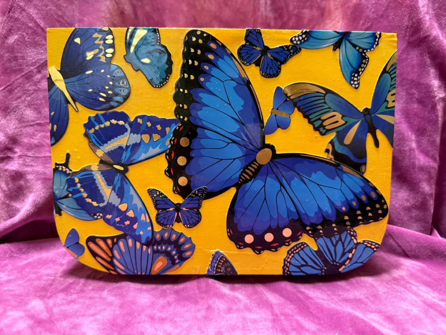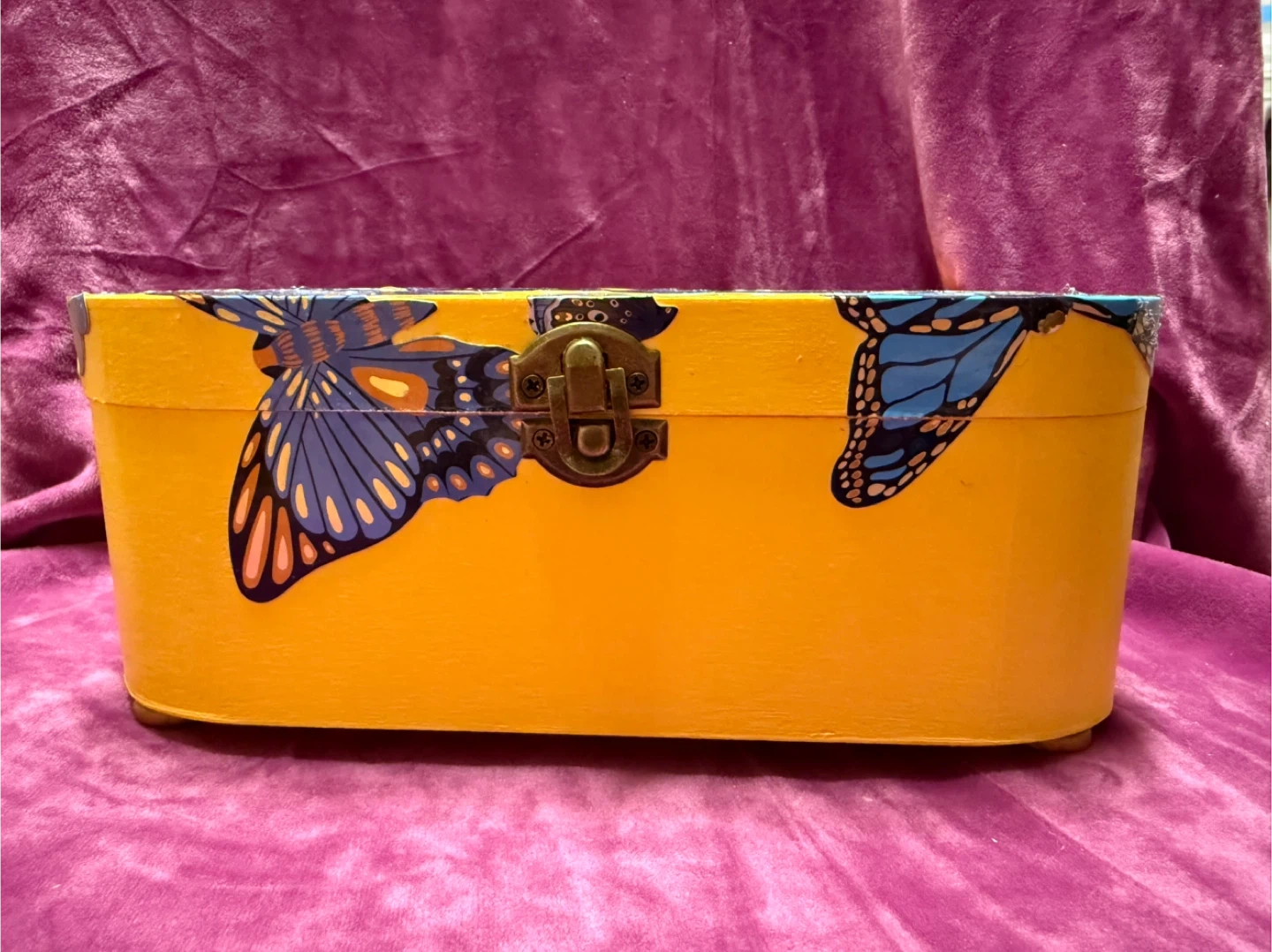 This bright yellow wooden jewelry box is decorated with lovely blue butterfly decals. It has a small mirror inside and a metal clasp closure and ring holder.