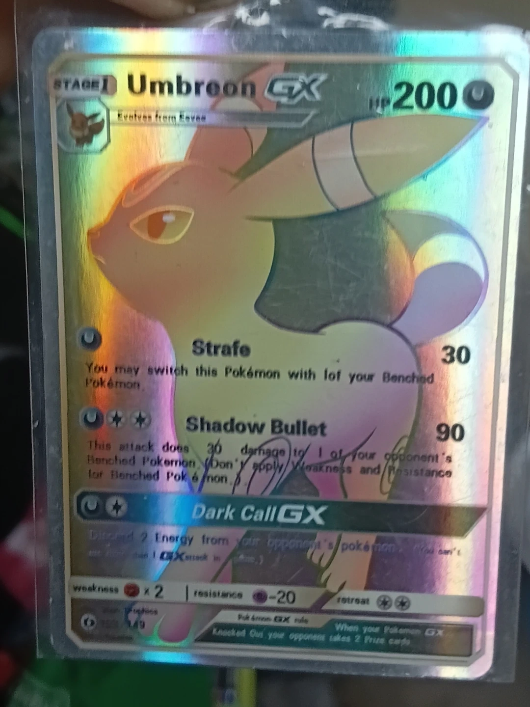 This is a Pokemon trading card featuring Umbreon GX. It has 200 HP and a rainbow foil finish. The card includes abilities like Strafe, Shadow Bullet, and Dark Call GX.