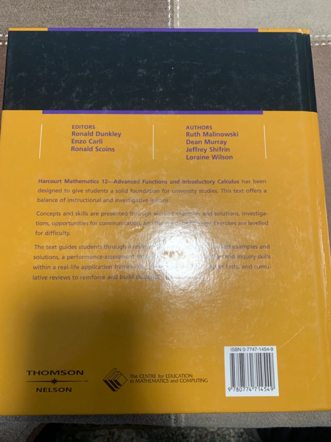 Used textbook for Advanced Functions and Introductory Calculus. Solid foundation for university studies. Includes worked examples, solutions, investigations, and opportunities for communication, reasoning, and problem solving. Leveled exercises and cumulative reviews.