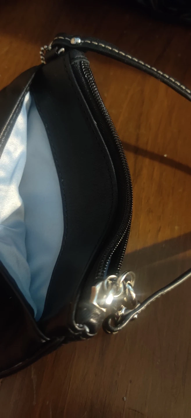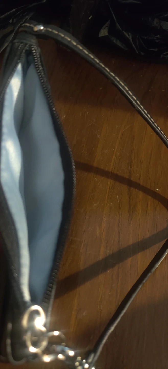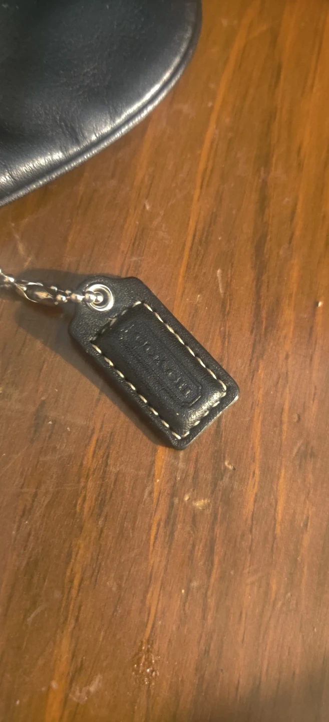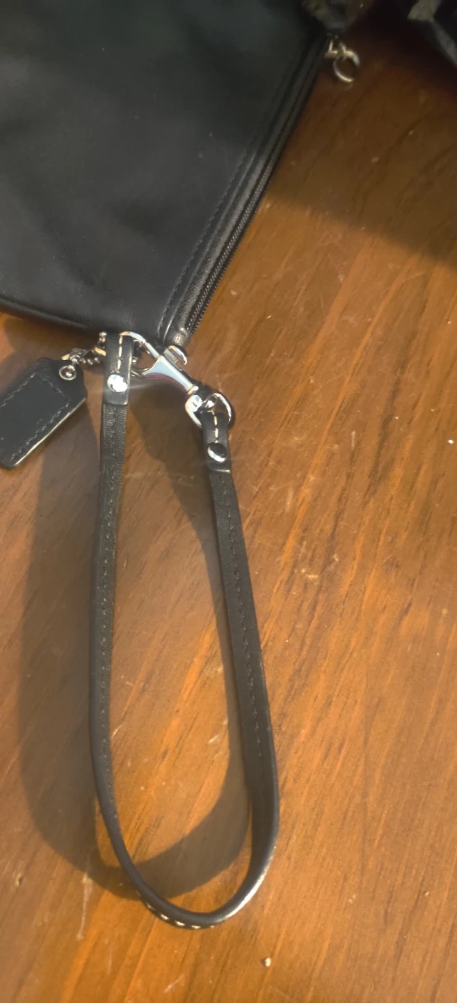 Coach wristlet pouch made of black leather. It has a zippered closure and a detachable wrist strap. The interior is lined in a light blue fabric.Will not fit your cellphone and does not have tje coach logo inside
