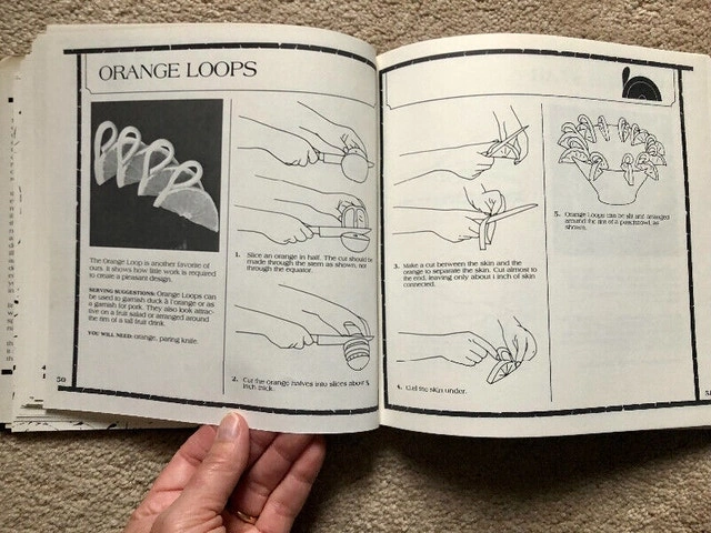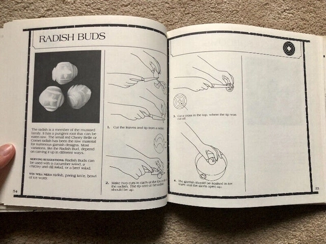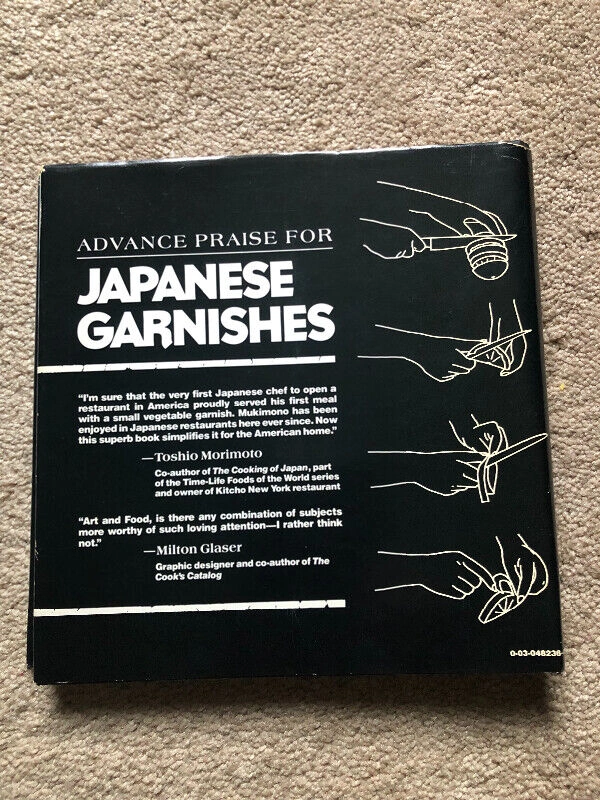 Vintage hardcover book demonstrating the technique of Mukimono with 50 different garnishes. Features simple line drawings, illustrated instructions, and black and white photographs. Measures 8.25” x 8.25” x .5” and has 103 pages. Published in 1980. The paper jacket is still attached and shows minor wear from storage. A name is written on the inside of the cover page. Pickup in Brampton, near Queen and Kennedy.