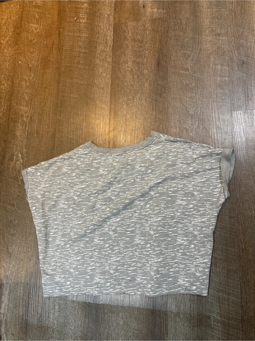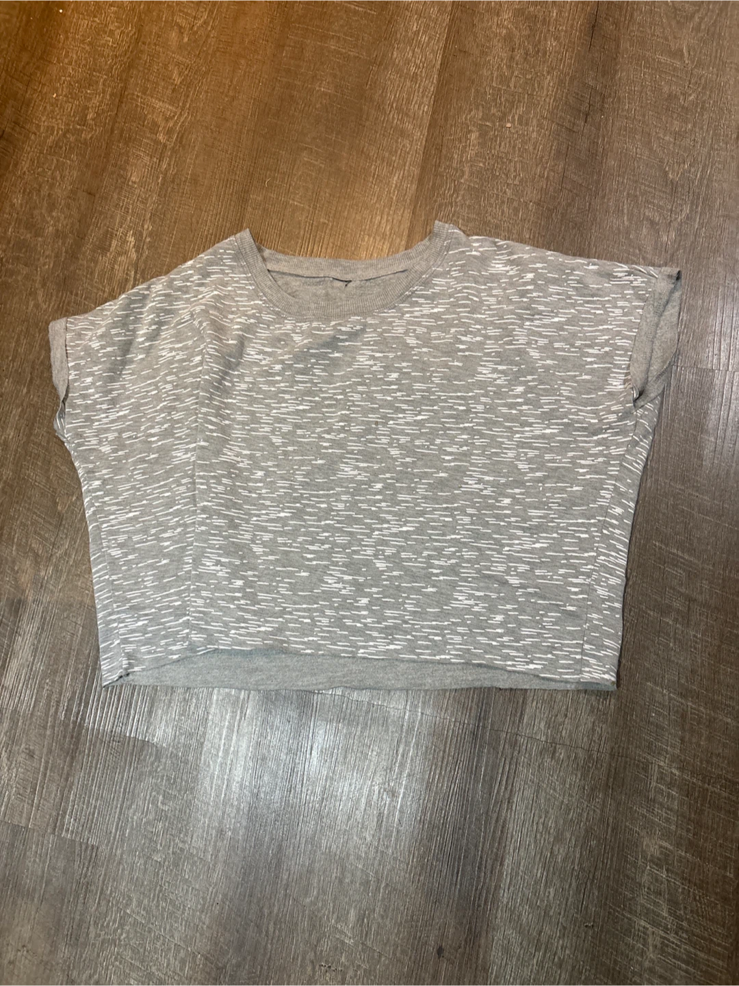 A comfy grey t-shirt with a marled white pattern. It's a short-sleeved, crewneck style. This shirt is perfect for casual wear.
