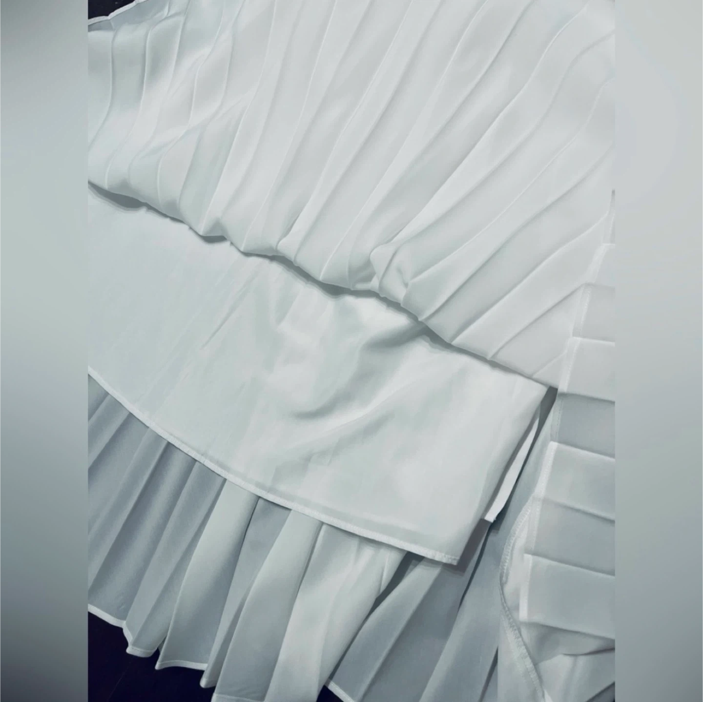 A flowing white pleated midi skirt with an elastic waistband. It's made from a lightweight chiffon-like material, perfect for warmer weather. This skirt is a versatile piece for layering or wearing on its own.