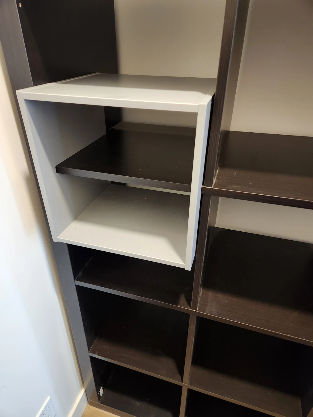 This is a dark brown KALLAX cube storage unit with a moveable grey cube insert. It is used, but still solid. Smoke free home.