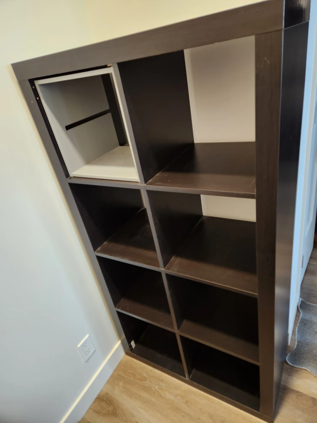 This is a dark brown KALLAX cube storage unit with a moveable grey cube insert. It is used, but still solid. Smoke free home.