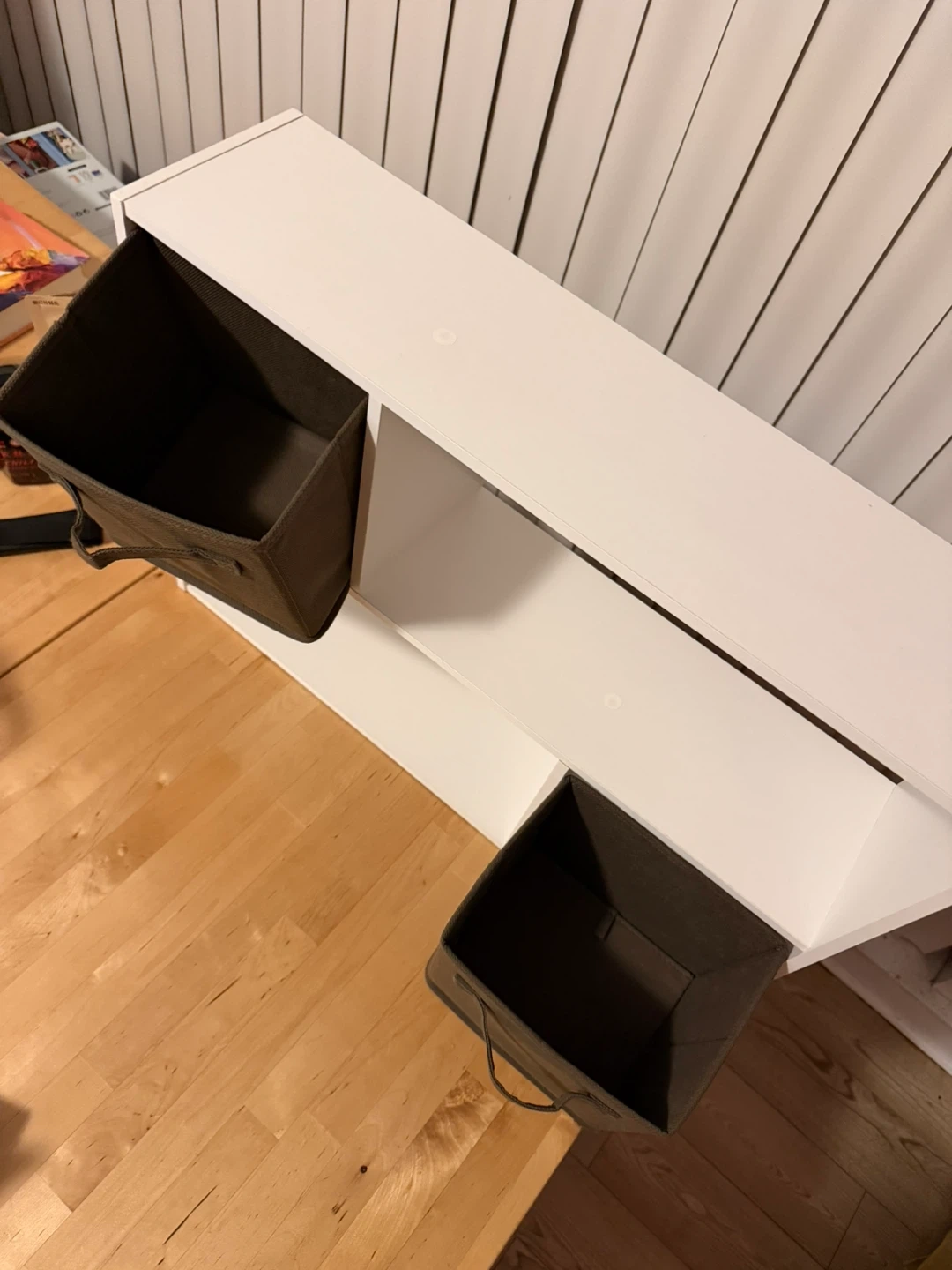 This white storage shelf features two cube-shaped compartments, each with a dark brown fabric bin. The bins have handles for easy access. It's a handy unit for organizing various items in your home. The shelf's open design allows for quick visibility of stored contents.