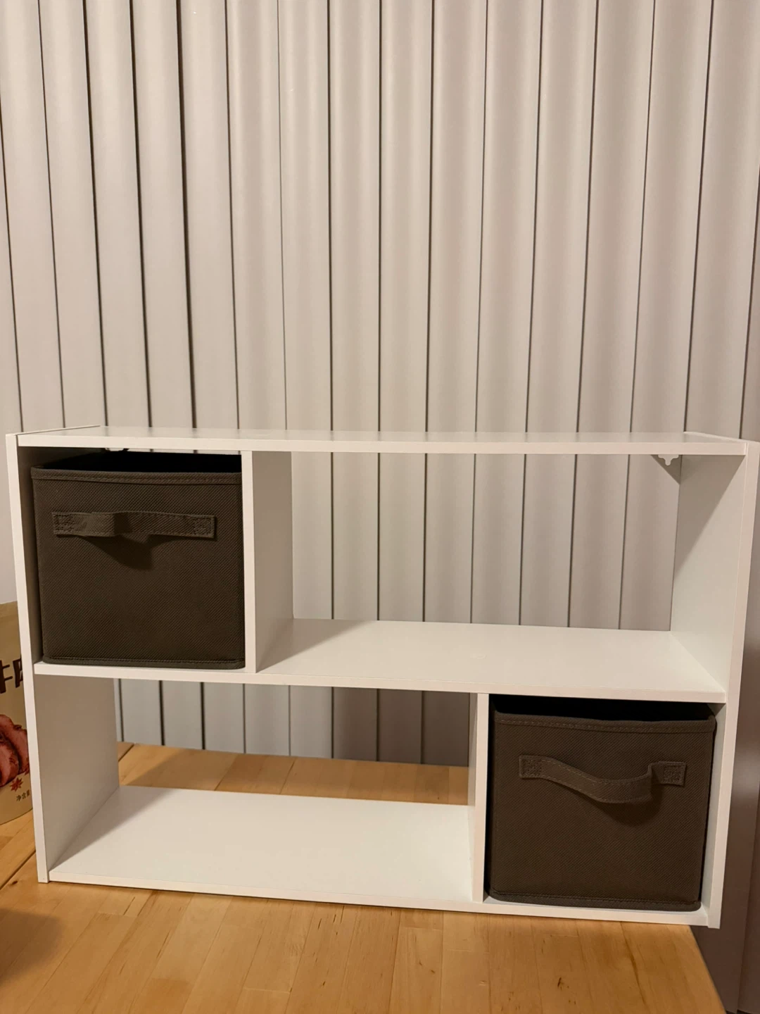 This white storage shelf features two cube-shaped compartments, each with a dark brown fabric bin. The bins have handles for easy access. It's a handy unit for organizing various items in your home. The shelf's open design allows for quick visibility of stored contents.