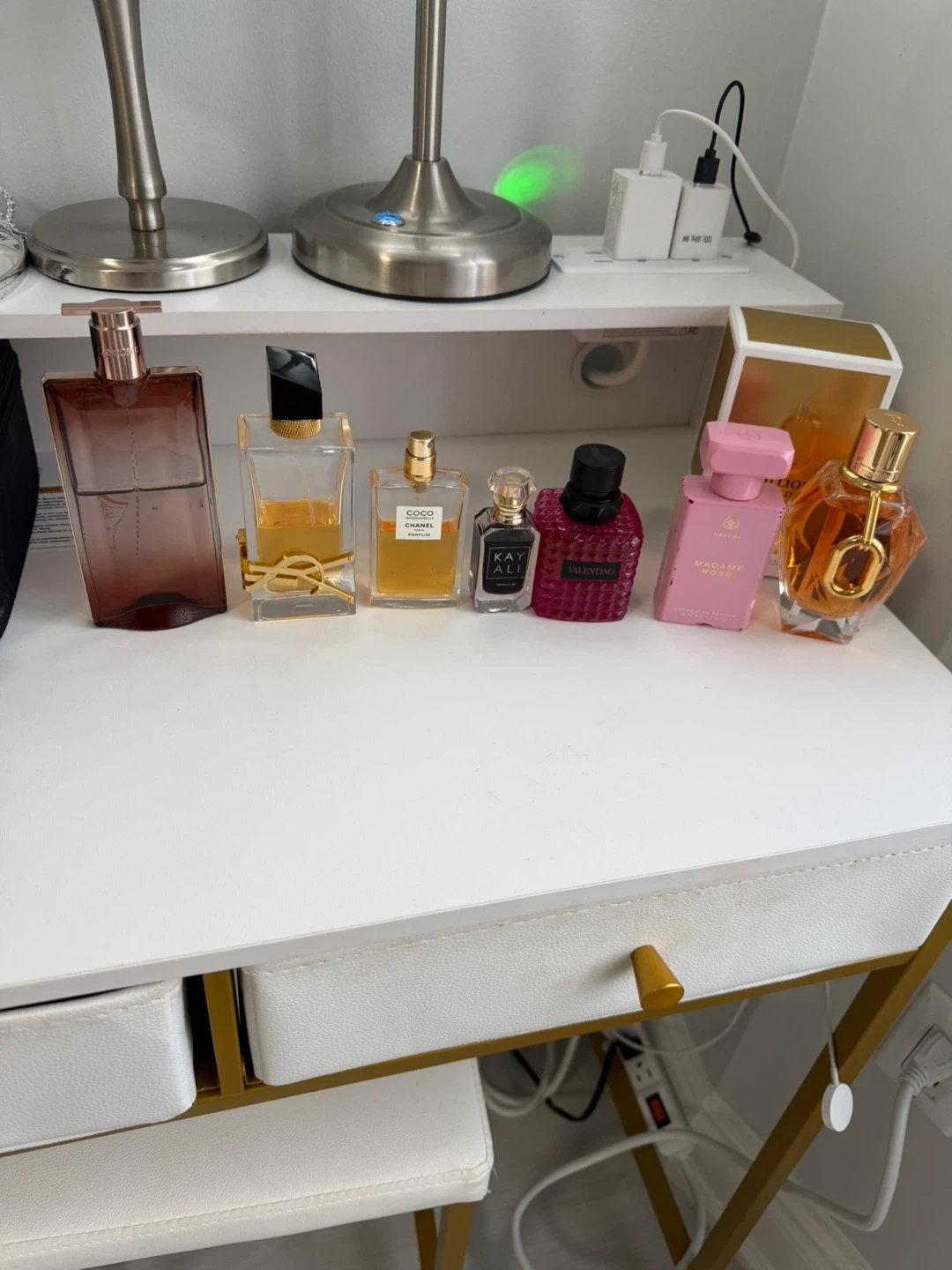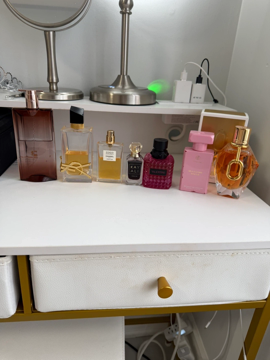 A collection of designer perfumes including Yves Saint Laurent, Valentino, and Chanel. Some bottles are full, others are partially used. Various sizes included in this lot.