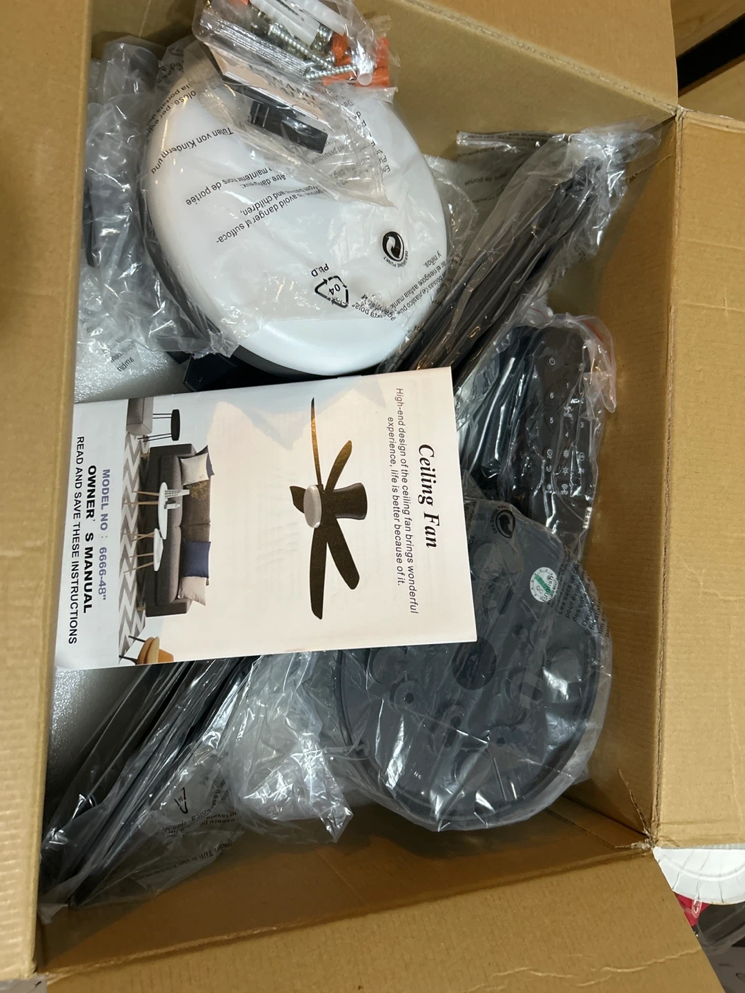 Selling a brand new ceiling fan with lights from Wiviniya Lighting! The box shows it's easy to install and has a DC motor. Perfect for adding a touch of light to any room
