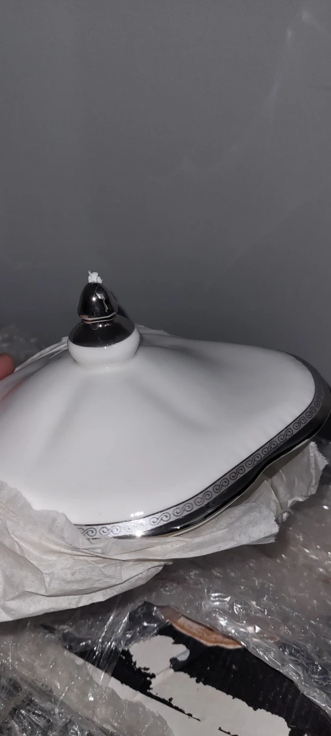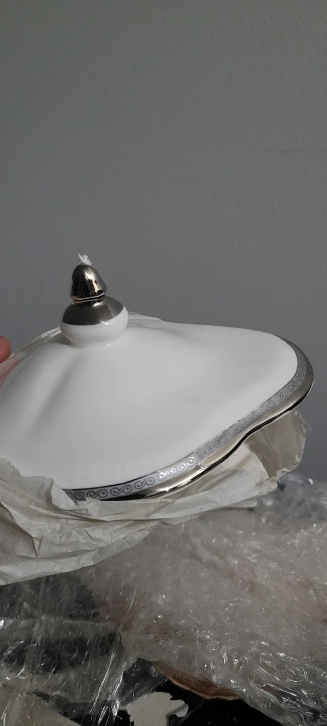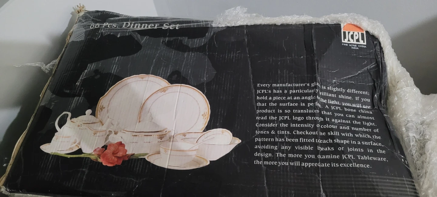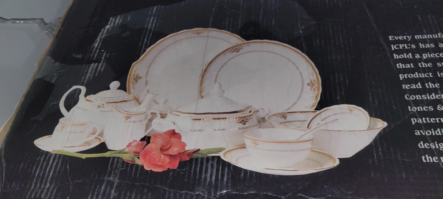 This is a JCPL 66 piece dinner set made of fine bone china. It features a classic design with gold trim. This set includes dinner plates, side plates, bowls, and a teapot with serving pieces.