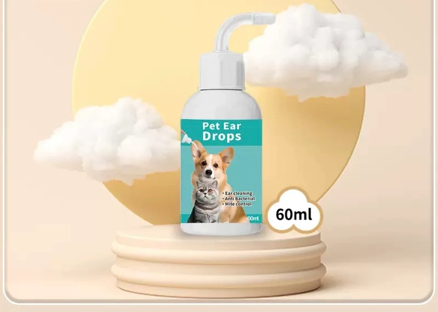 This is a 60ml bottle of Pet Ear Drops. It's designed for ear cleaning, with anti-bacterial and mite control properties. This would be useful for pet owners looking to maintain their pet's ear hygiene.