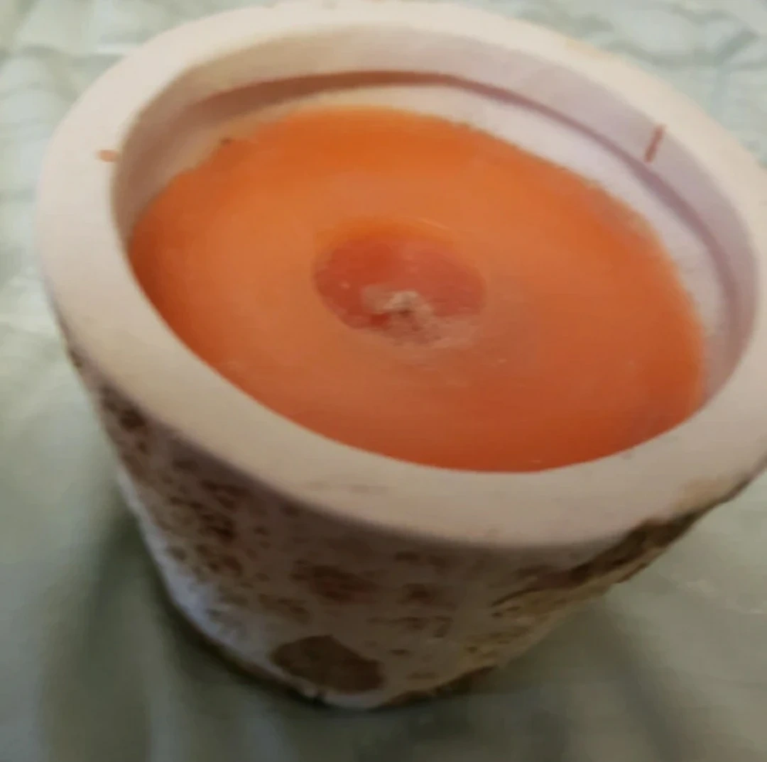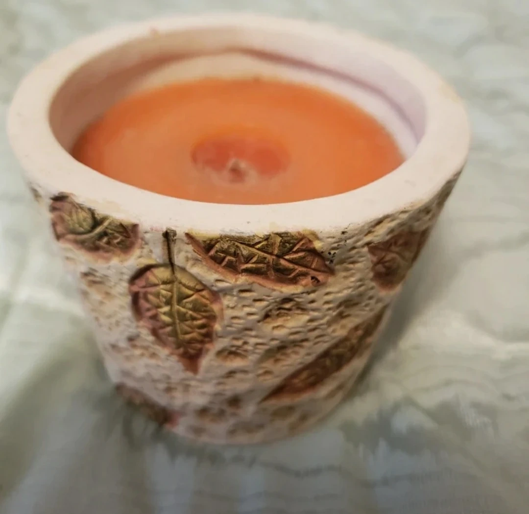 Orange candle in a textured pot with leaf designs. Adds a cozy ambiance to any room.