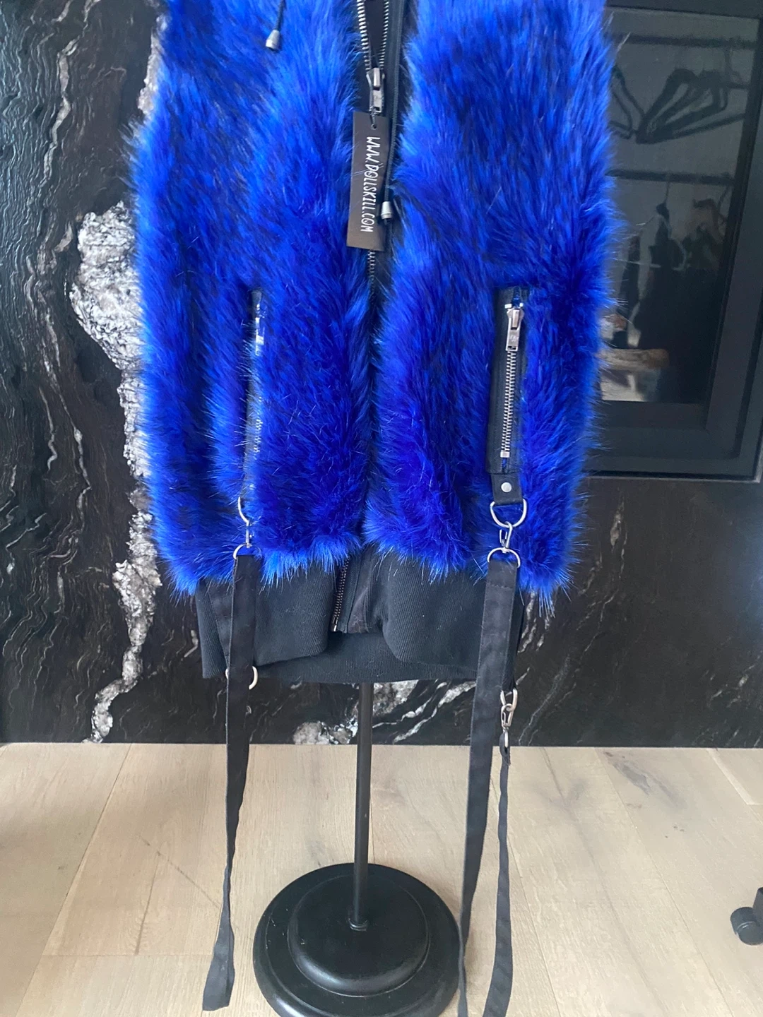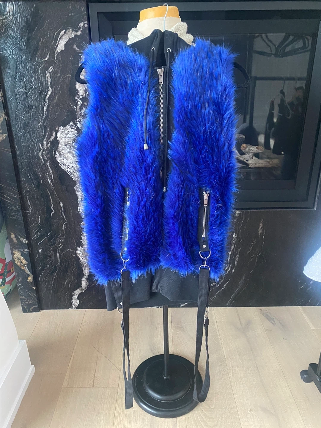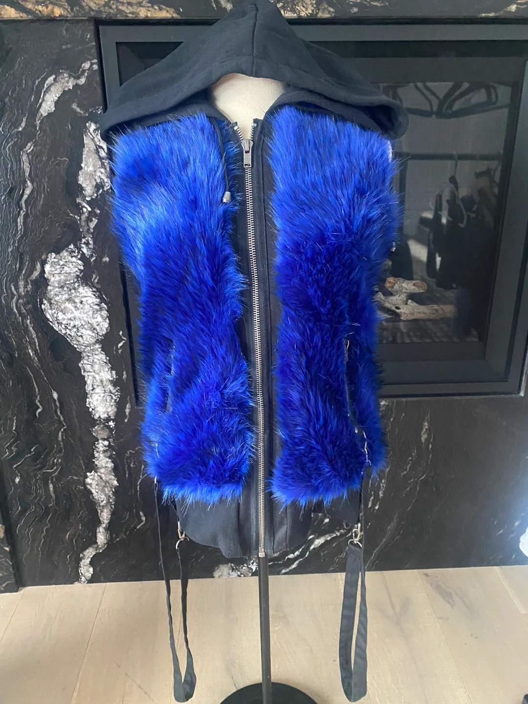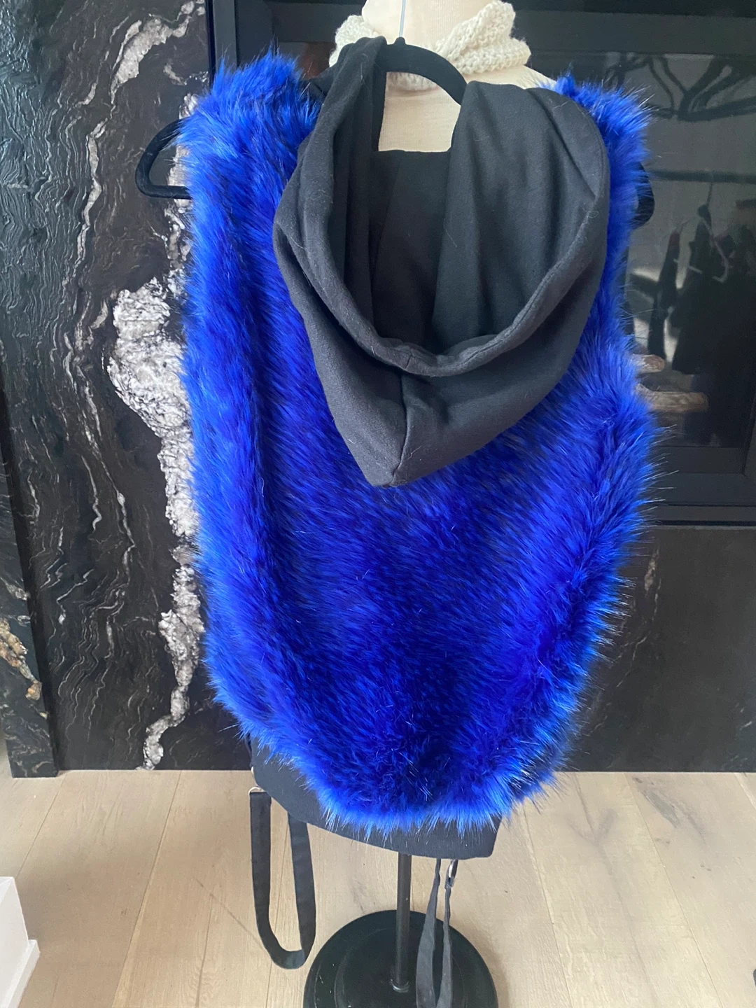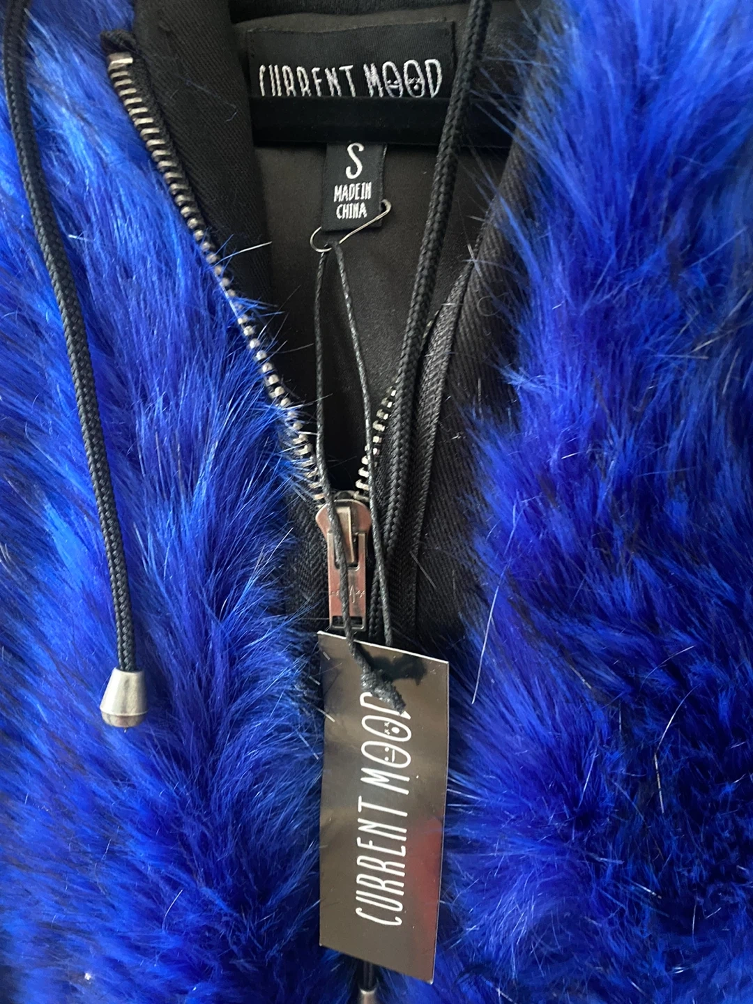 Check out this vibrant blue faux fur vest from Current Mood! It's a size small and features a black hoodie underneath the faux fur. Great for adding a pop of colour to your wardrobe!