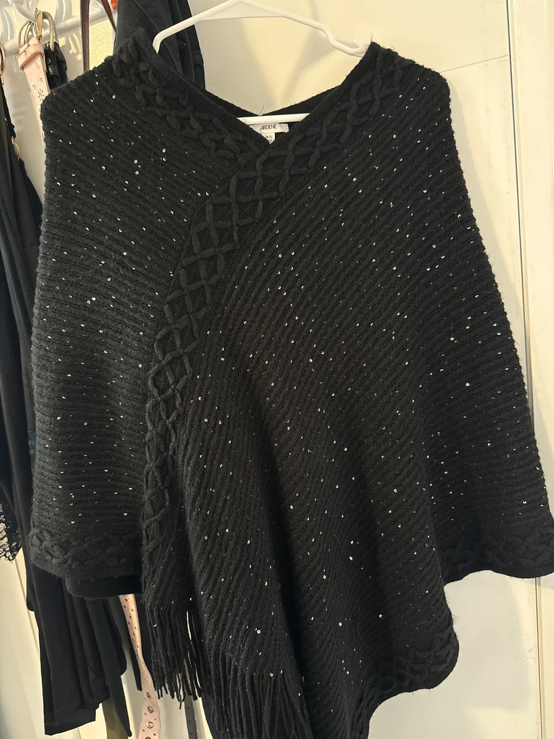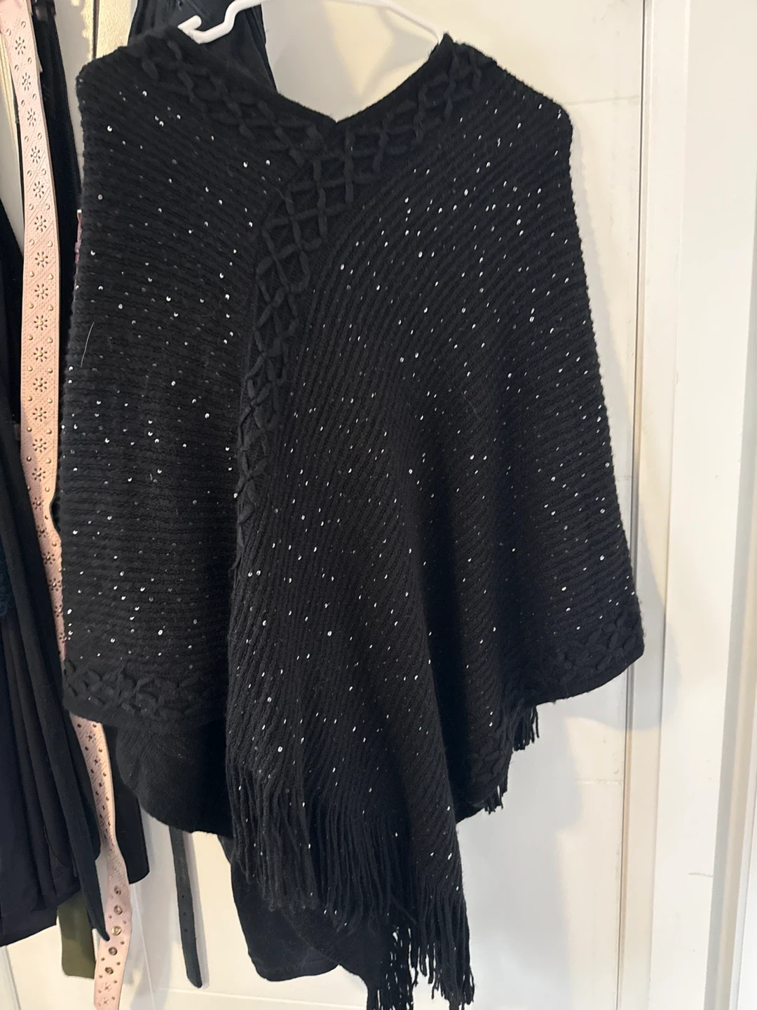 This black poncho is covered in small silver sequins and has braided detailing on the front. It also features a fringe hemline for added style. It's a cozy and sparkly addition to any wardrobe!