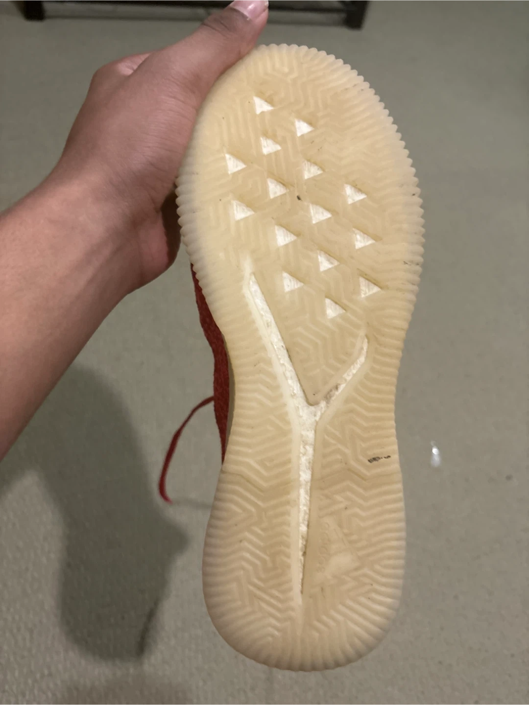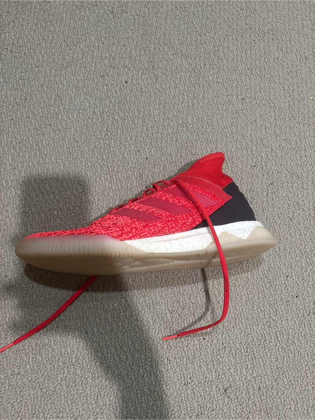 Red Adidas athletic shoes with a knit upper and lace-up closure. Features a cushioned sole for comfort. Ideal for training or casual wear.