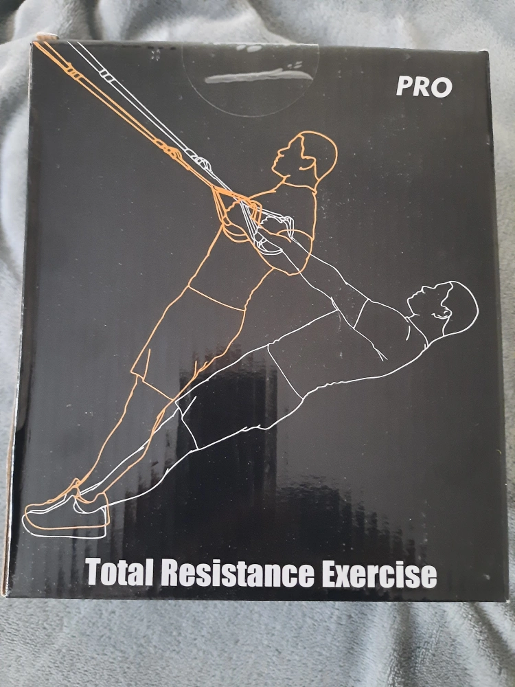 The box shows a total resistance exercise system. There is an illustration of a person using the system. This kit is great for building strength and flexibility at home.