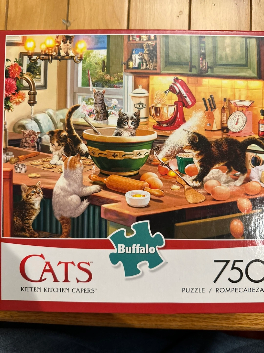 Complete 750-piece jigsaw puzzle. Features adorable kittens baking. Brand new, still in original packaging.