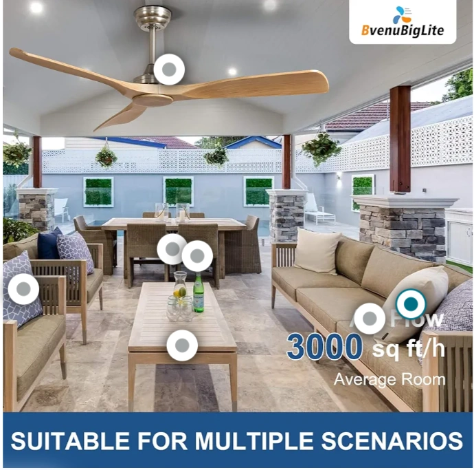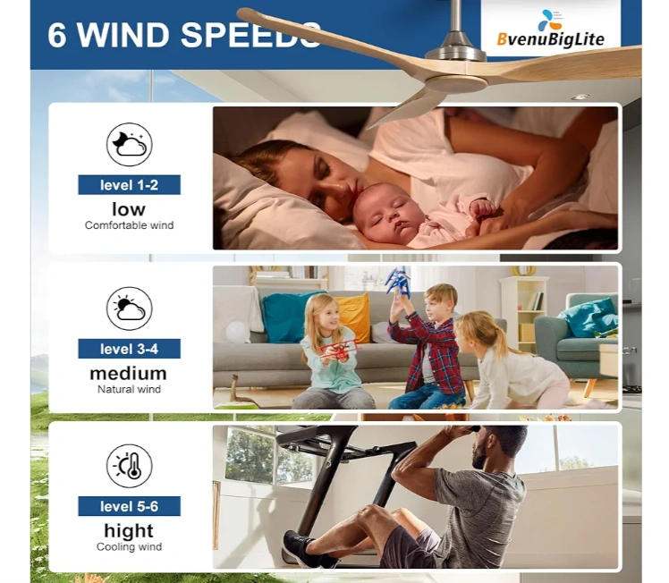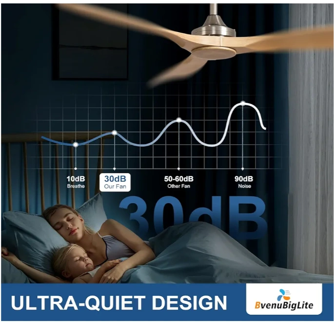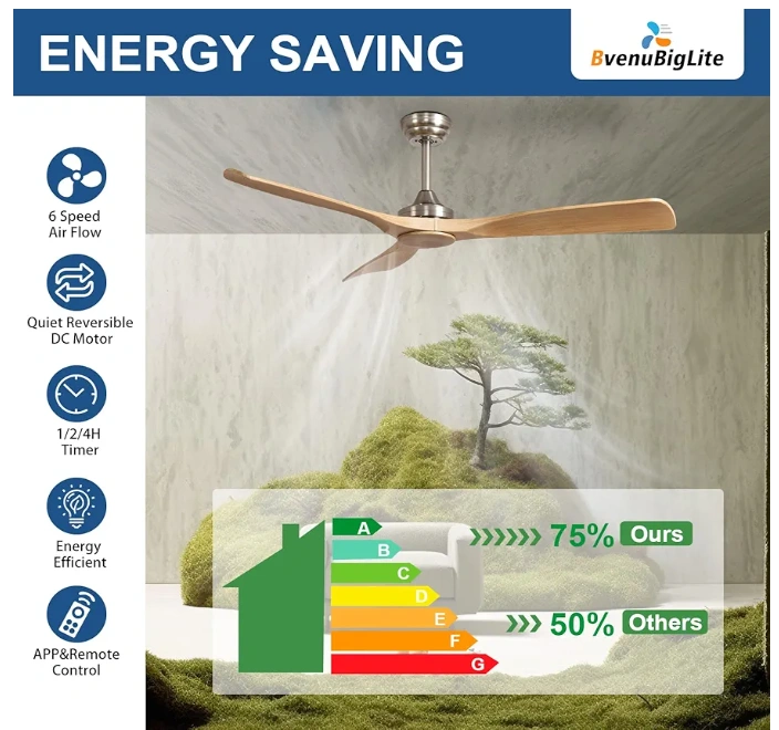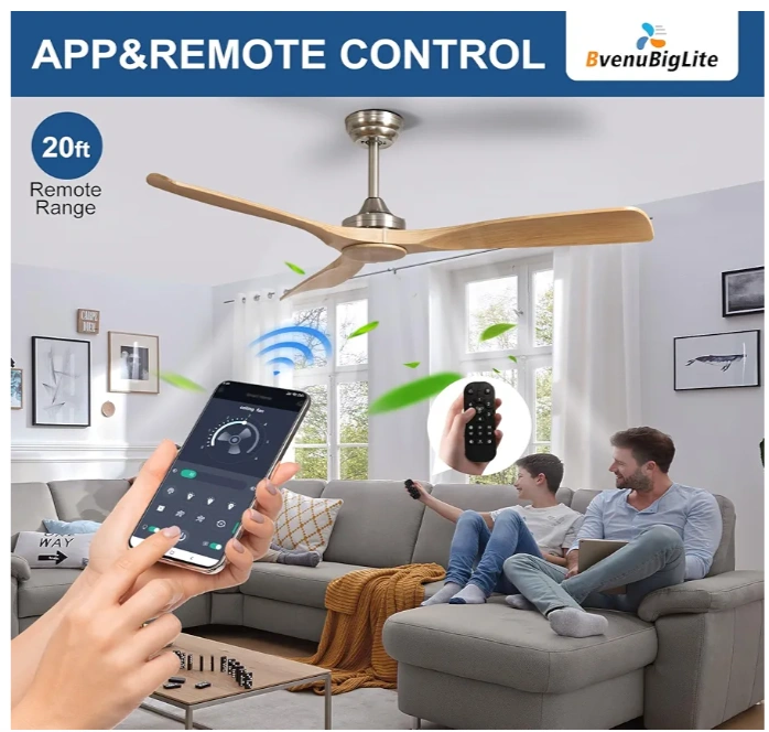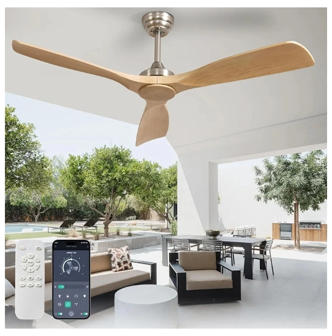 Three-blade ceilingfan with Remote & App Control. Brushed nickel finish. Wooden blades. App and remote control. Quiet operation. Reversible function for year-round use. Energy efficient. Timer function. BRAND NEW! Still in the box!