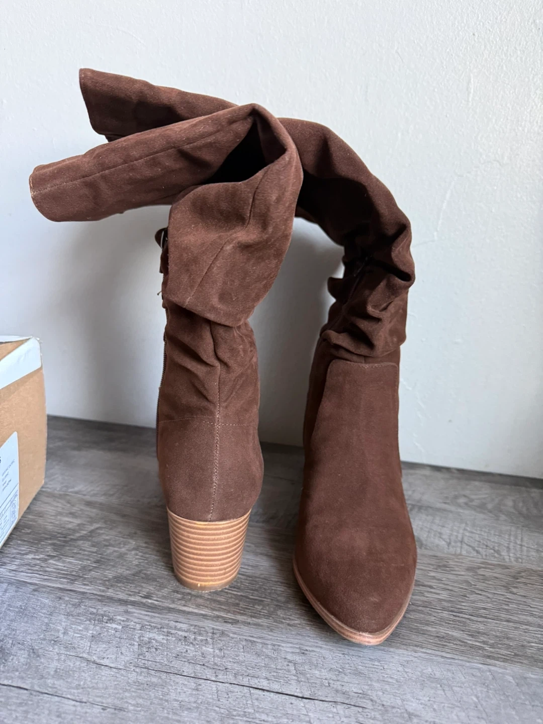 These ruched slouchy boots come in a Dark Toffee Brown colour. They feature a block heel and a pointed toe. Include original box.