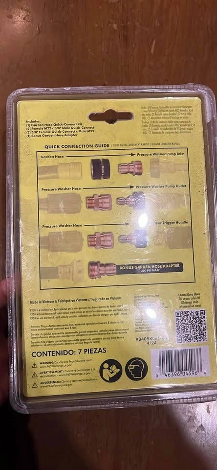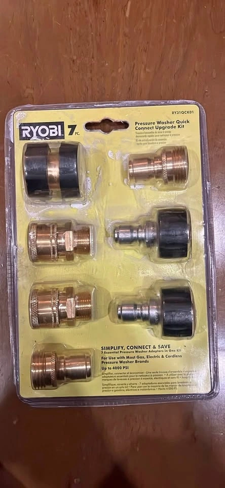 New Ryobi Pressure Washer Quick Connect Upgrade Kit. This kit has 7 essential adapters for your pressure washer. Works with most gas, electric, and cordless pressure washer brands. Handles up to 4000 PSI. Includes a garden hose quick-connect kit, Female M22 x 3/8 inch Male Quick-Connects, 3/8 inch Female Quick-Connect x Male M22, and a bonus garden hose adapter.