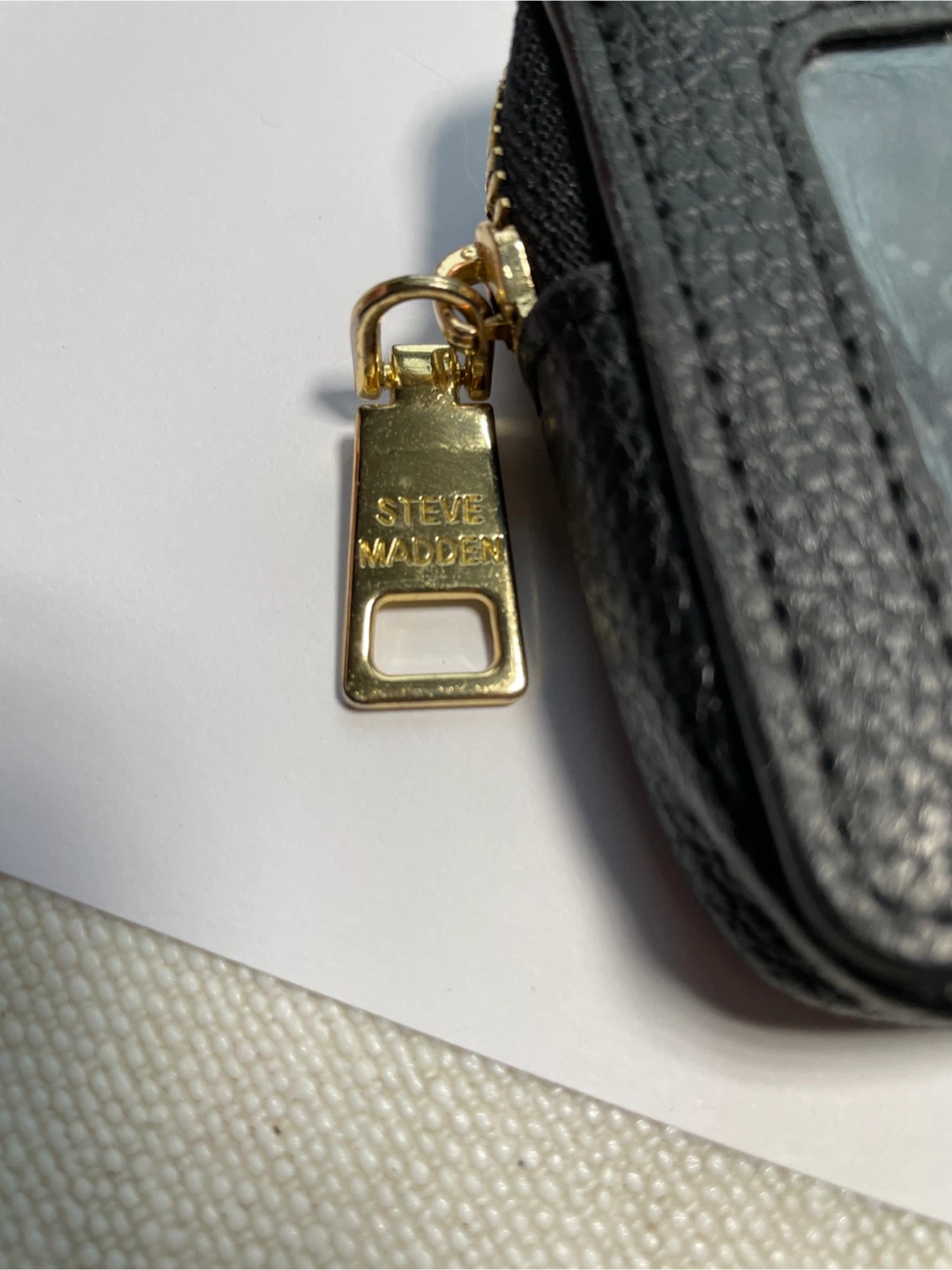 This black card holder is from Steve Madden. It features a clear ID window and a zippered compartment. Includes a detachable wrist strap.