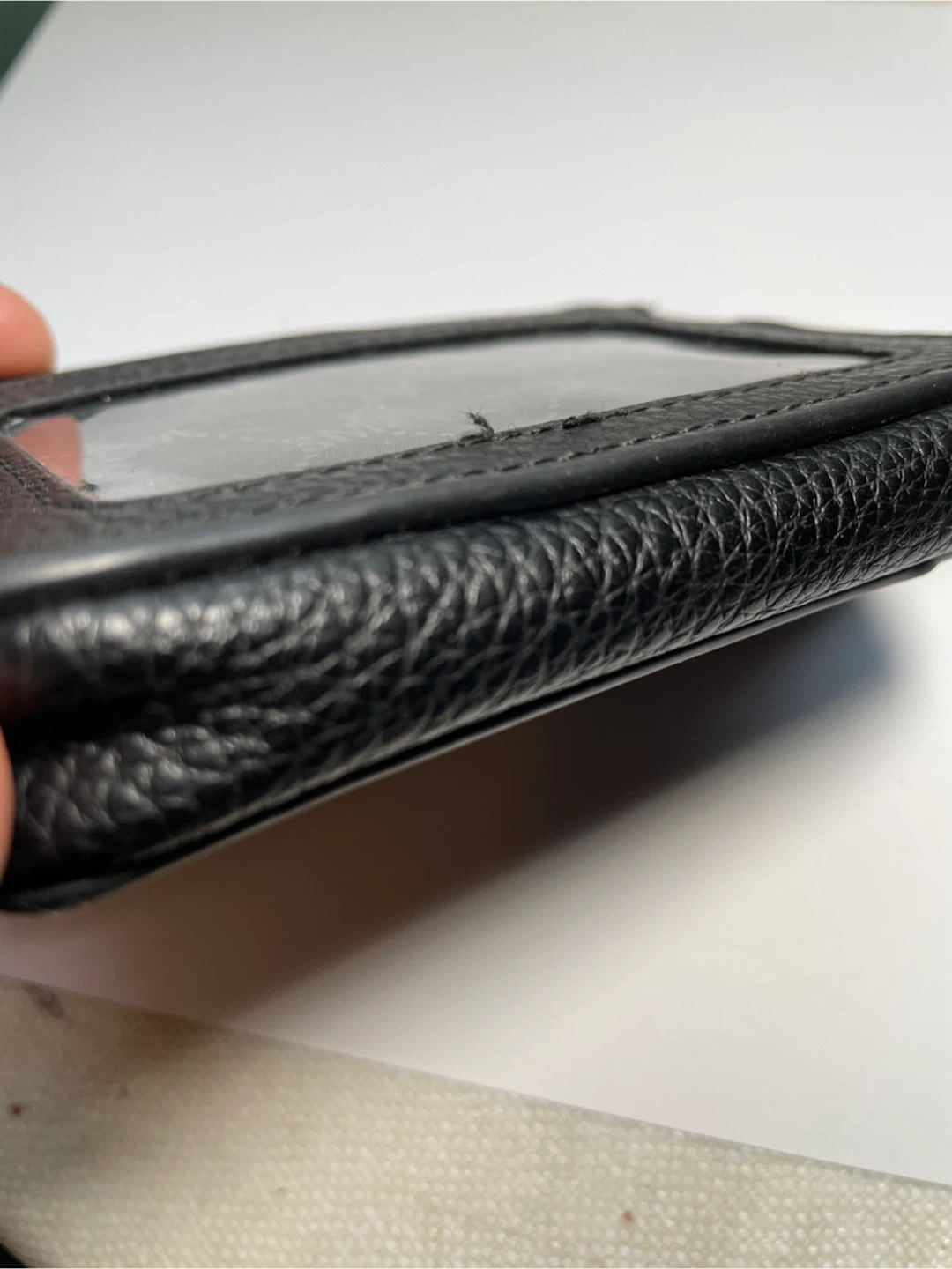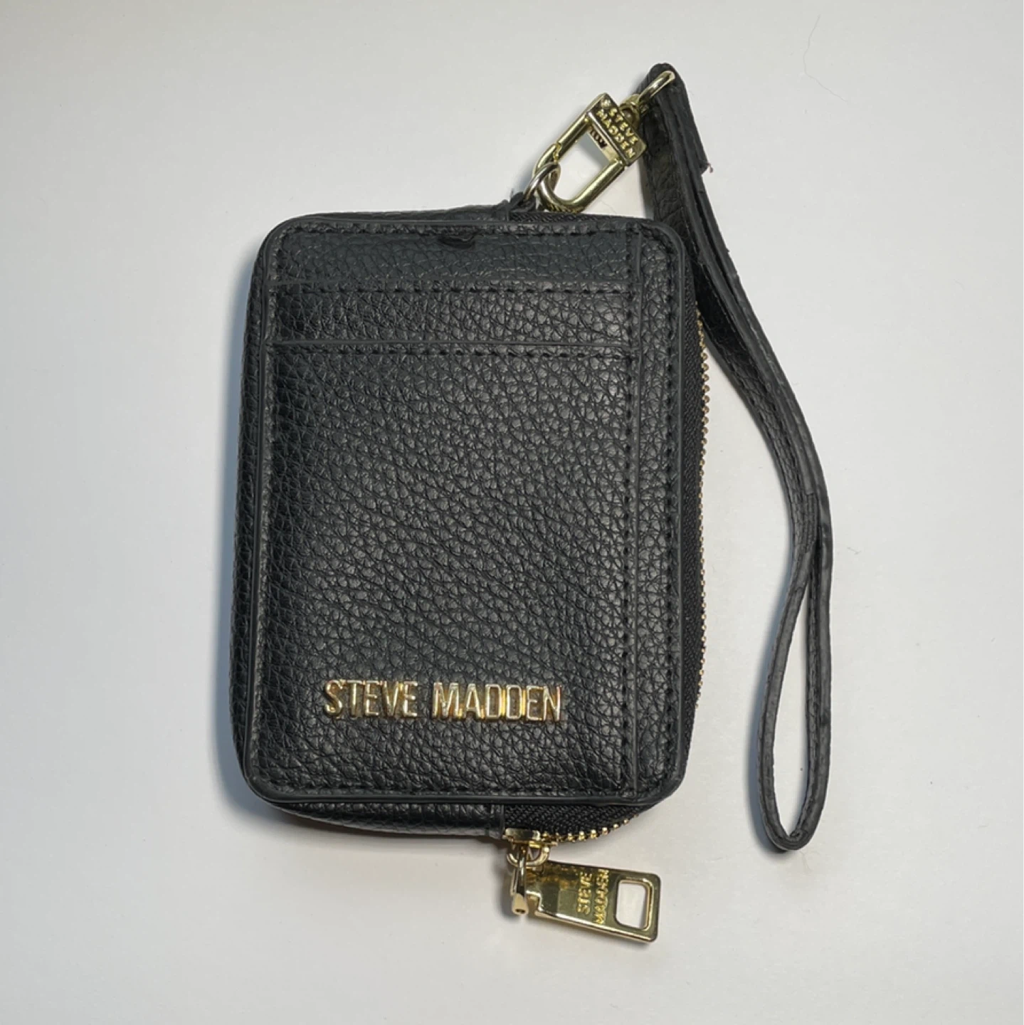This black card holder is from Steve Madden. It features a clear ID window and a zippered compartment. Includes a detachable wrist strap.