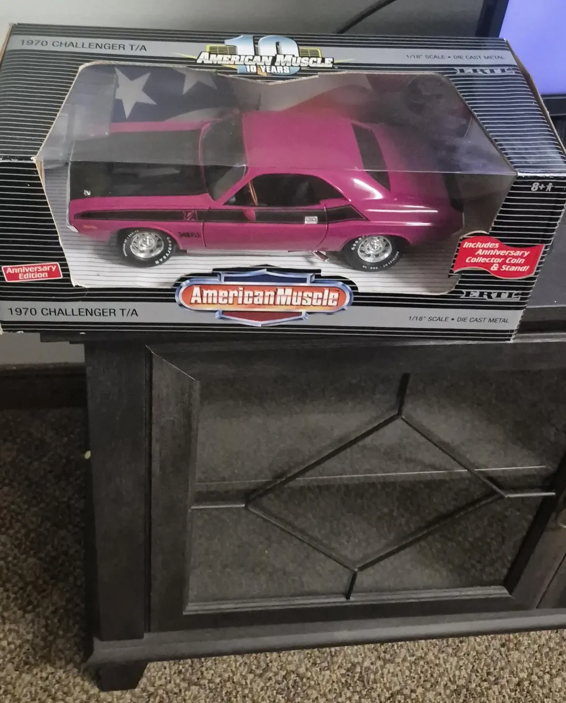 Selling an American Muscle 1970 Challenger T/A diecast model car. It's a 1/18 scale replica and comes in the original box. Includes an anniversary collector coin and stand!
