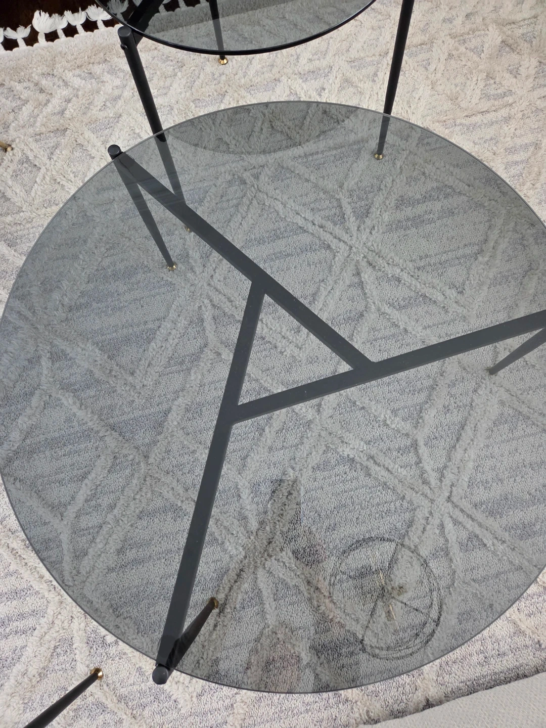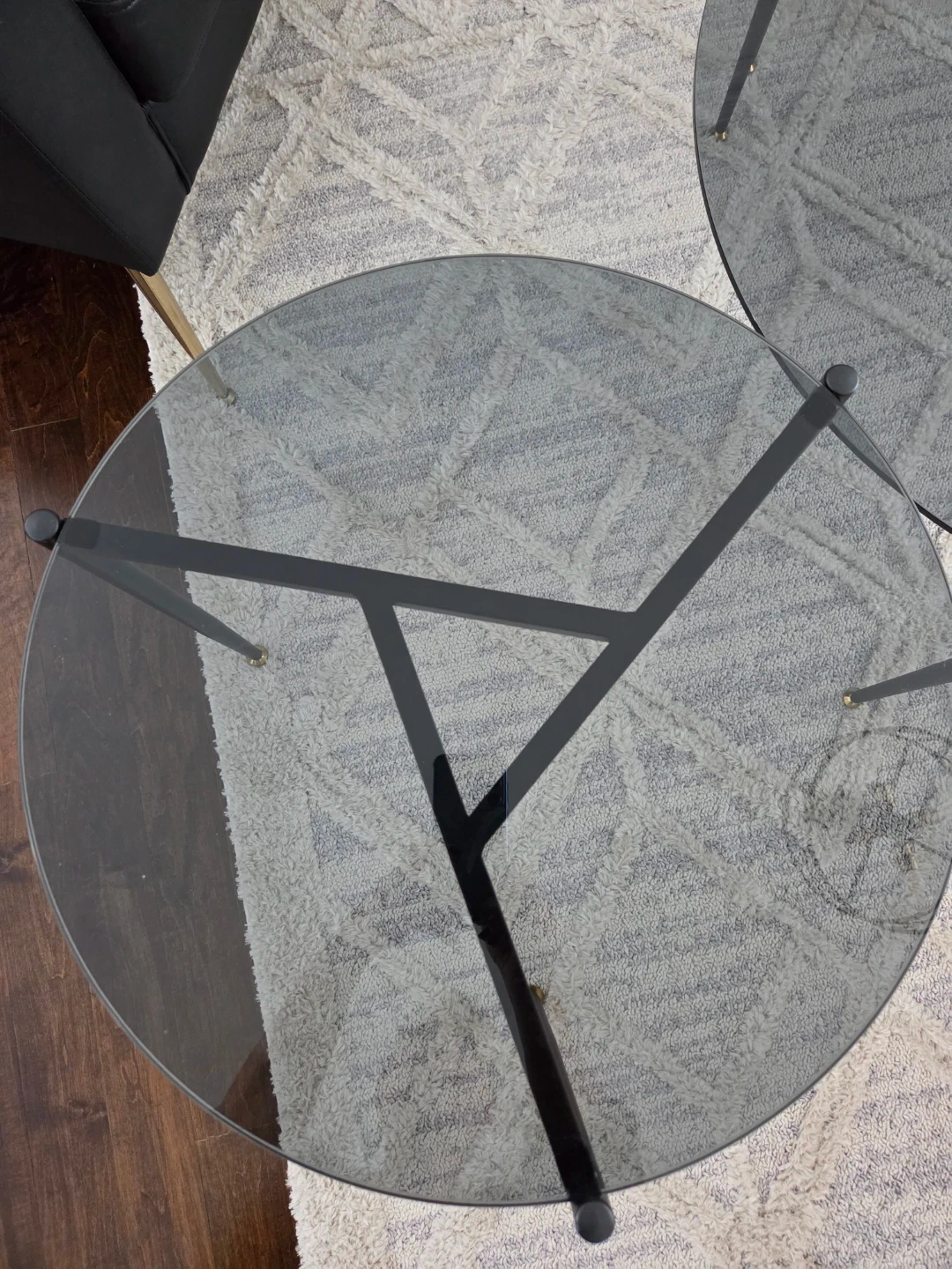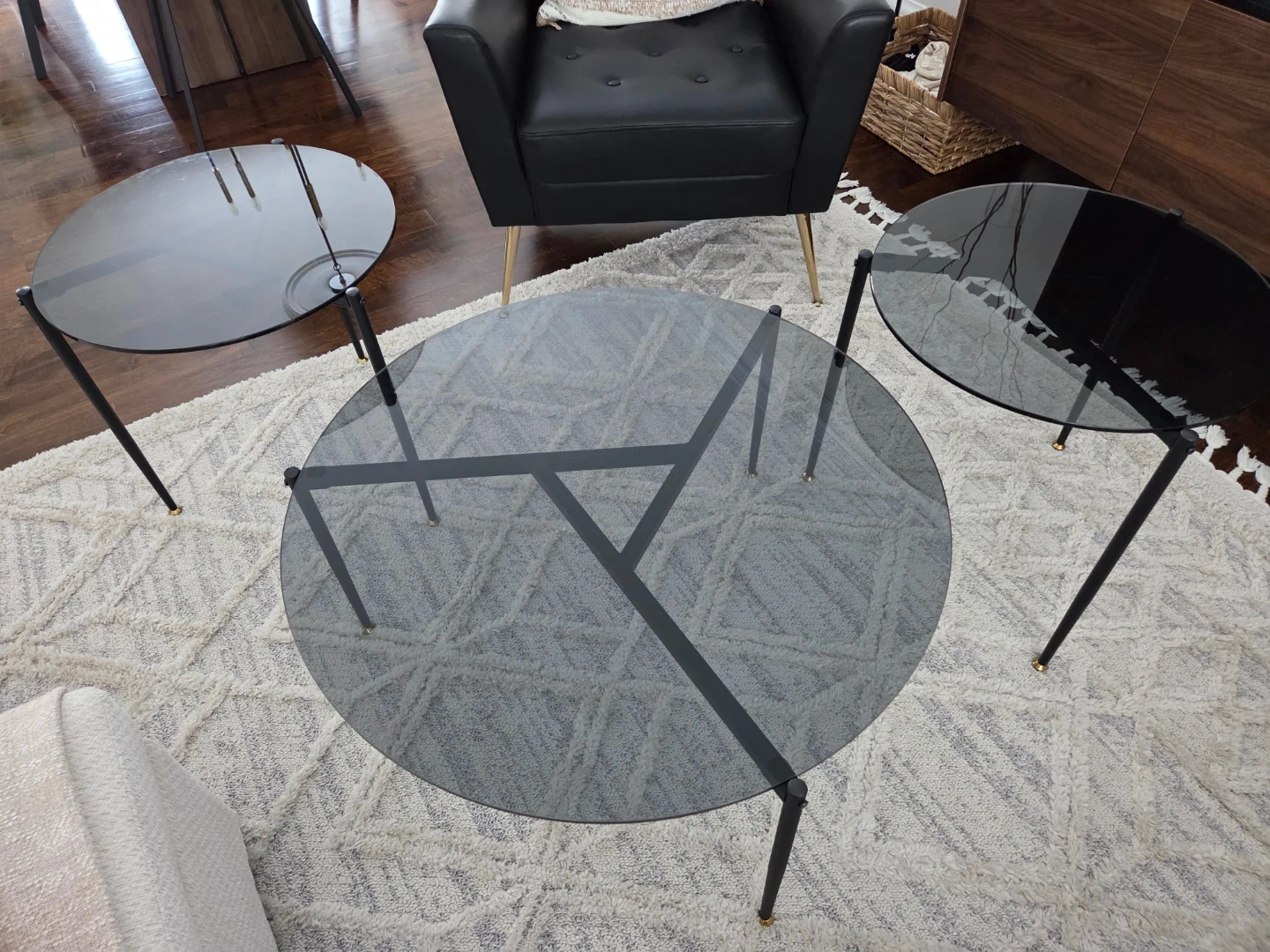 A set of three round glass coffee tables. Each table features a smoked glass top and a black metal frame with gold accents. These tables offer a modern look for your living space.