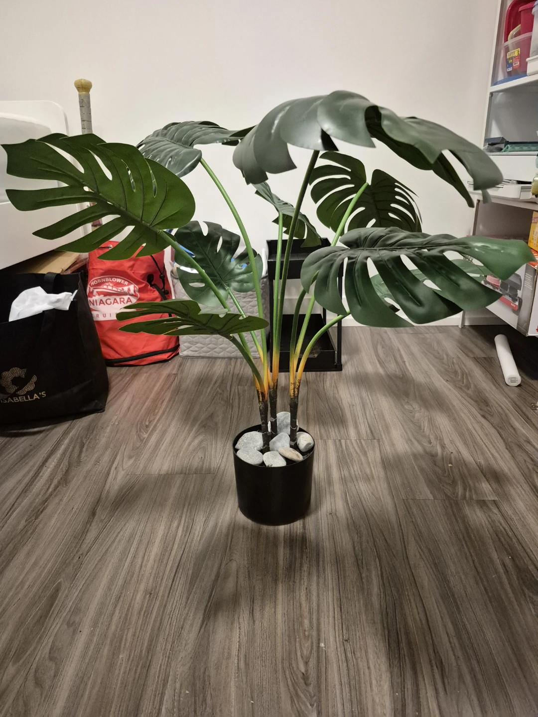 Ikea artificial Monstera plant in a black pot. It's a great way to add a touch of greenery to your home without the hassle of real plant care.