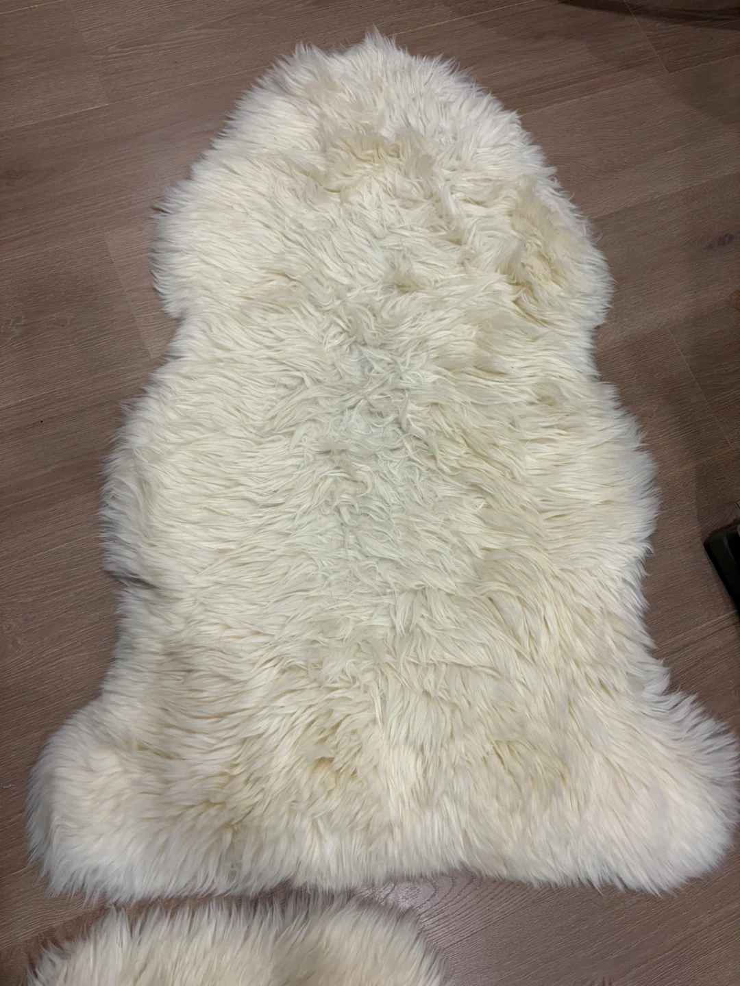 This is a natural sheepskin rug. It's soft and has a plush texture.