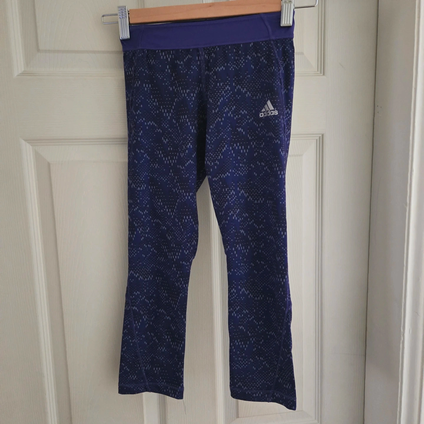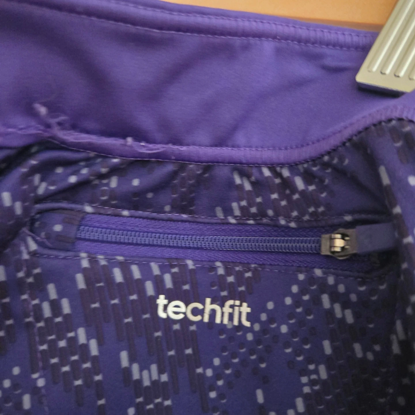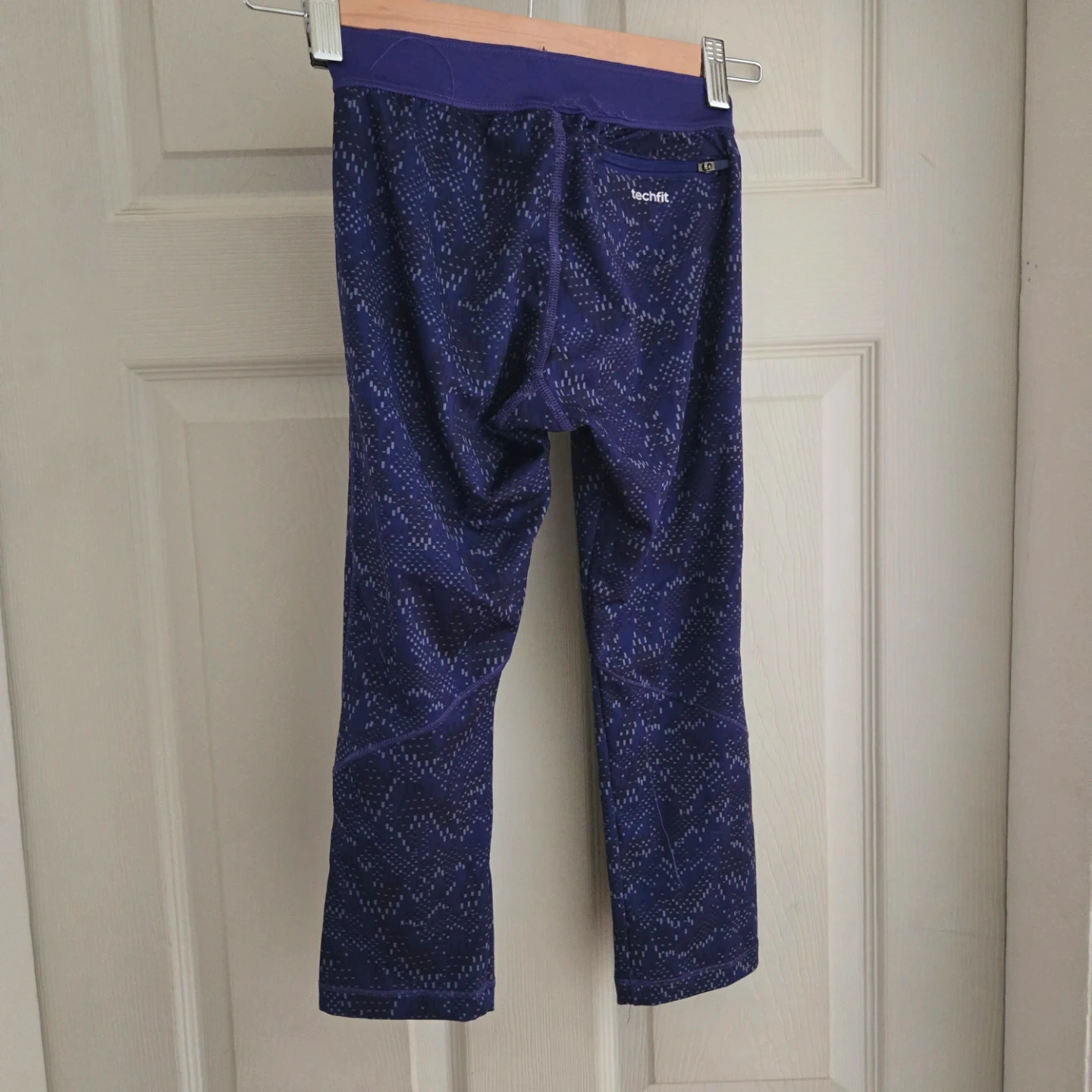 These Adidas Techfit capri leggings are purple with a subtle patterned design. They feature a zippered pocket at the back for essentials.
