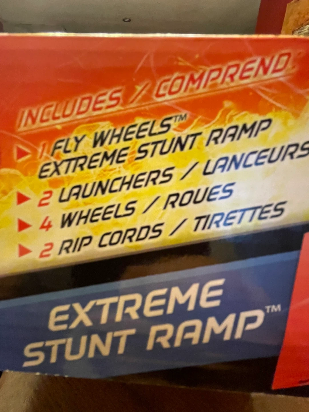 Includes 1 Fly Wheels Extreme Stunt Ramp, 2 launchers, 4 wheels, and 2 rip cords. Build and connect multiple ramps for even bigger stunts! This usually comes with only one launcher and two wheels. This particular one has two launchers and four wheel wheels.