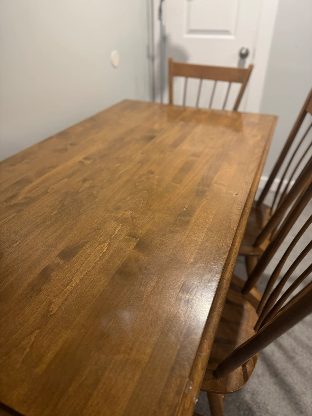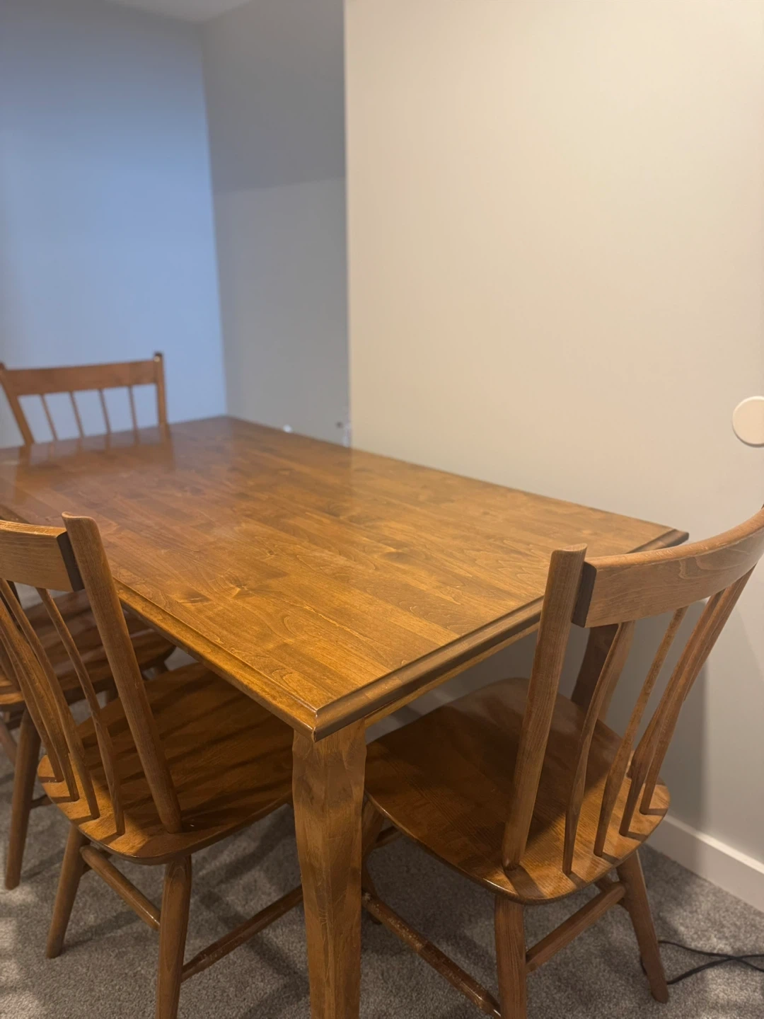 This is a lovely wooden dining set that seats four. It's perfect for smaller dining spaces or eat-in kitchens. The chairs have a classic spindle back design. Made of solid wood.