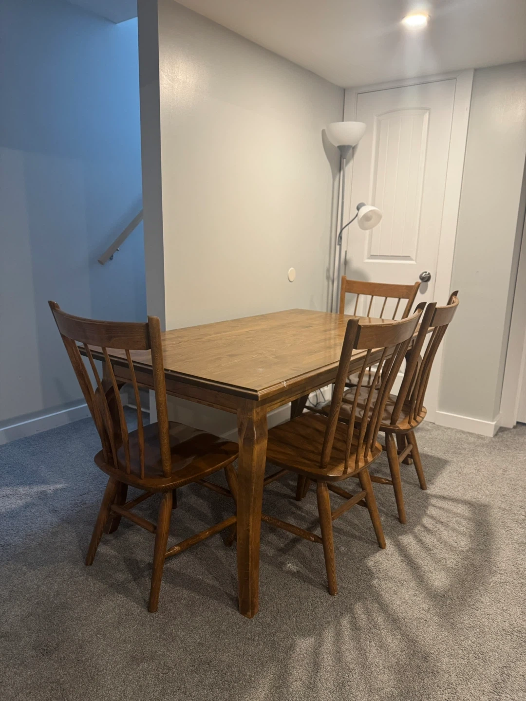 This is a lovely wooden dining set that seats four. It's perfect for smaller dining spaces or eat-in kitchens. The chairs have a classic spindle back design. Made of solid wood.