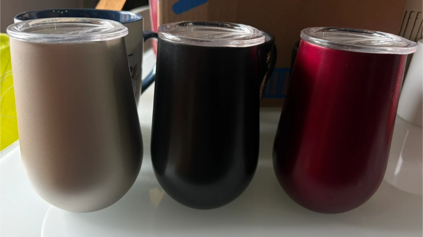 Three stainless steel stemless tumblers with lids. These insulated cups keep drinks cold or hot. They're perfect for wine, coffee, or any beverage on the go. Holds approximately 12 oz.