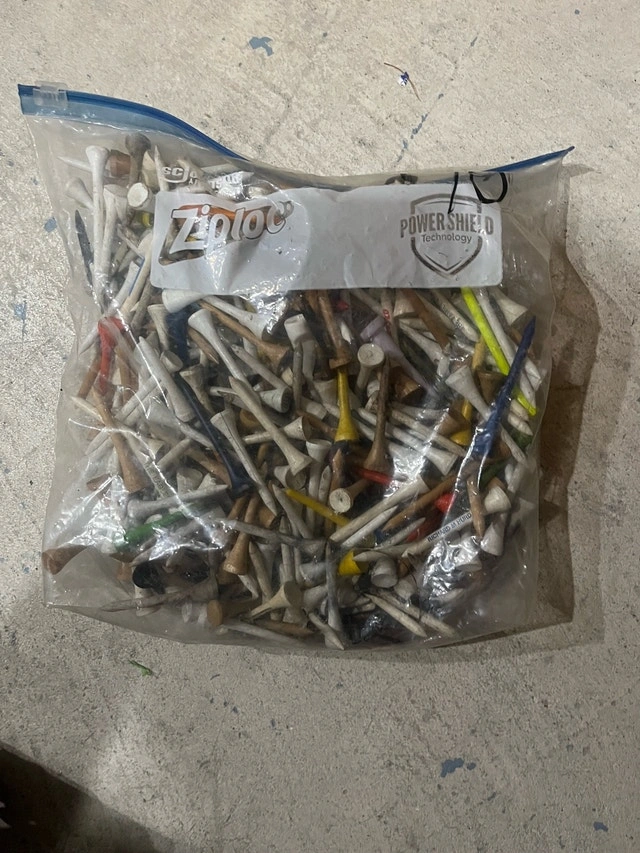 Enhance your golf game with this bulk bag of golf tees, containing a mix of wooden and plastic tees in various colours and sizes. This is a mix of used tees. Perfect for practice rounds or stocking up your golf bag. Whether you're teeing off on the first hole or just hitting the driving range, these tees will get the job done. Cash accepted.