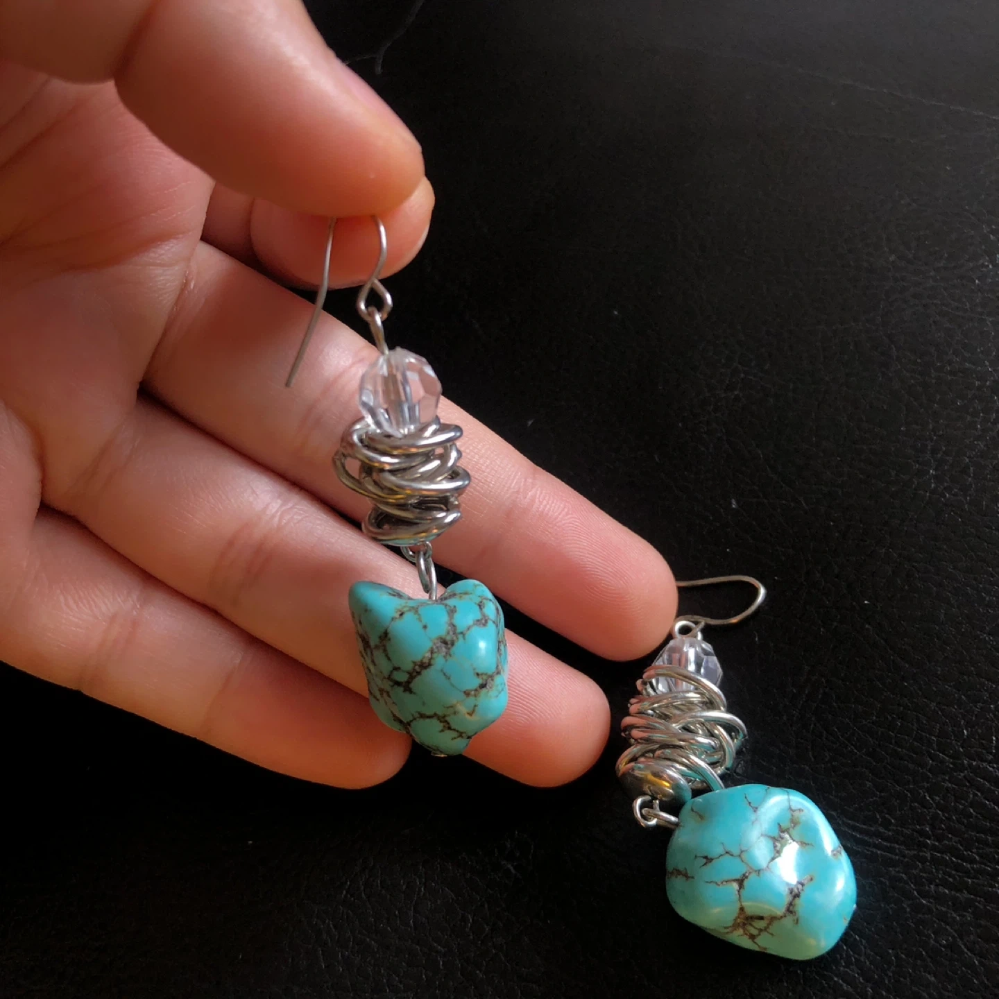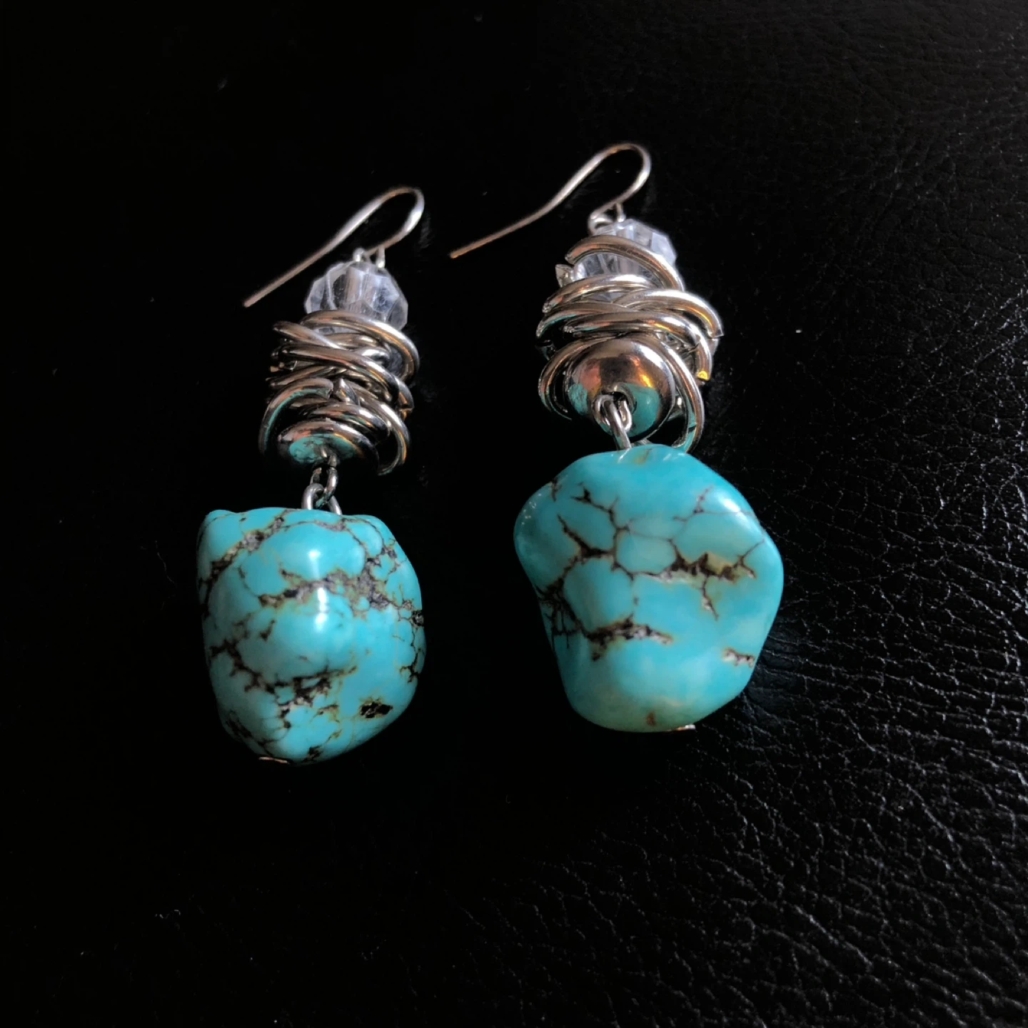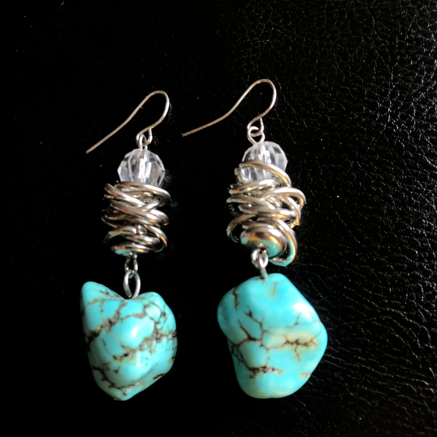 These unique drop earrings feature genuine turquoise stones with intricate silver wire wrapping. They include clear bead accents and silver fish hook closures. A lovely statement piece!