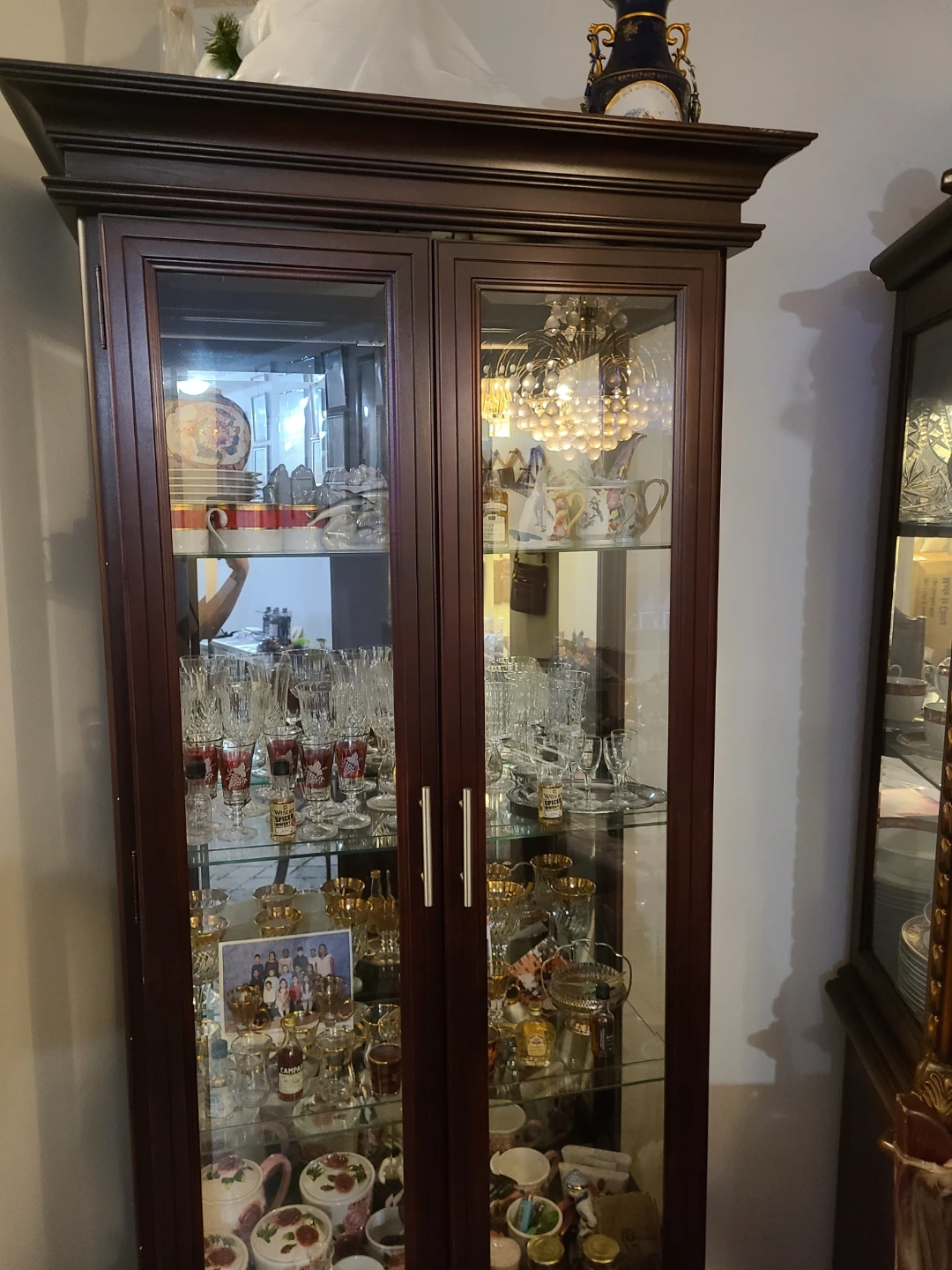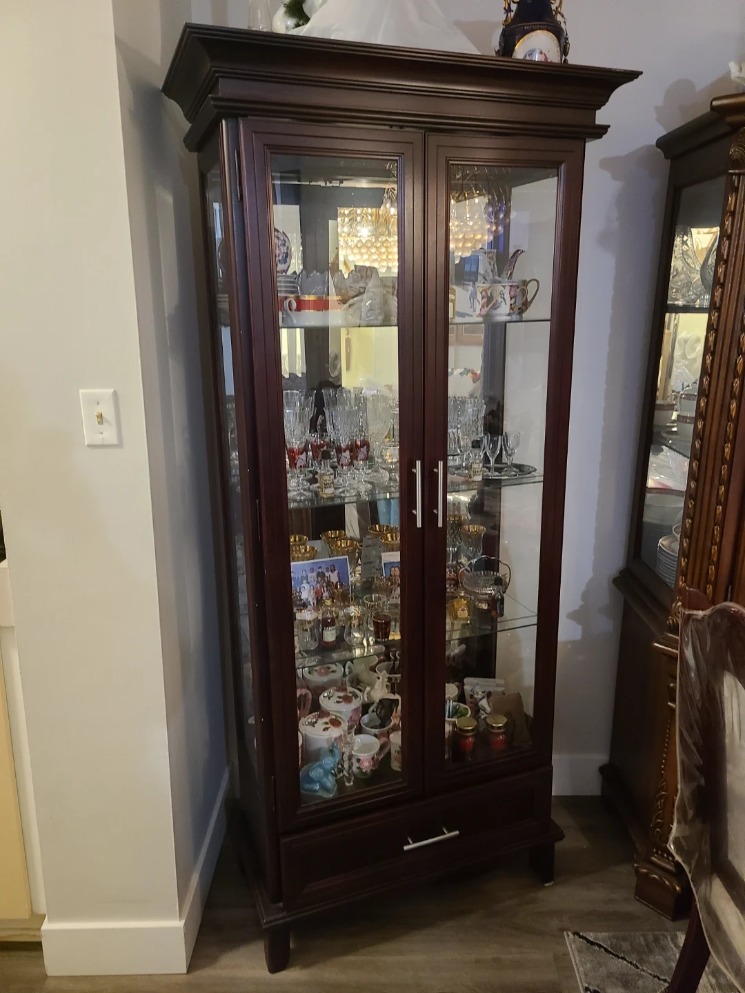 A dark wood display cabinet with glass doors. It has multiple shelves perfect for showcasing dishes and collectibles. Includes a bottom drawer for extra storage. This cabinet would be great for a dining room or living space!
