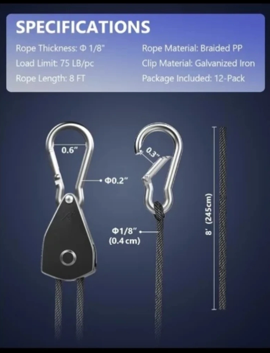 12-pack included. The load limit is 75 LB/pc and the rope length is 8 FT. These are useful for hanging items that need to be securely fastened.