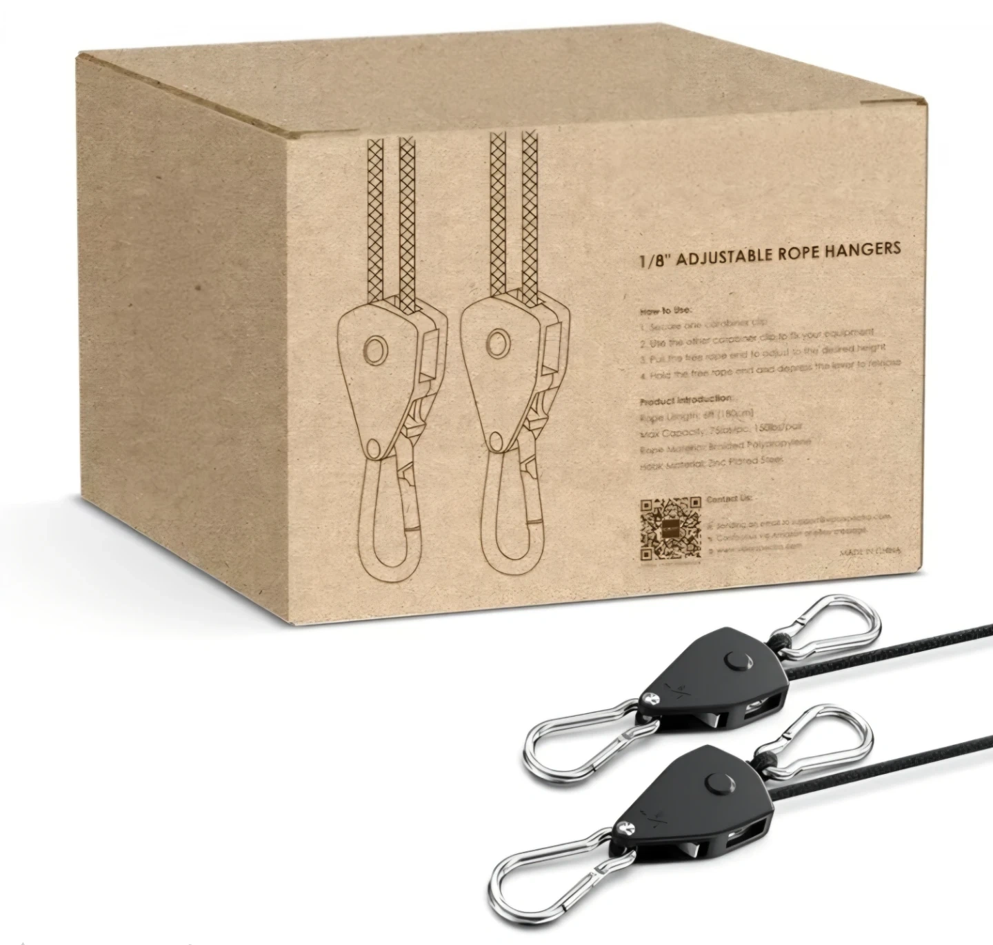 These rope hangers feature a braided PP rope and galvanized iron carabiners.