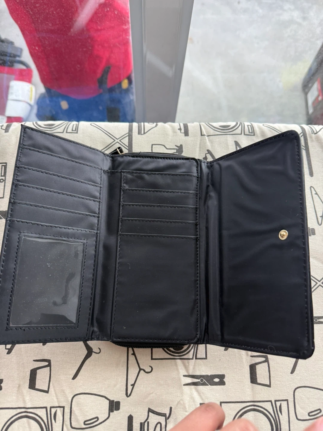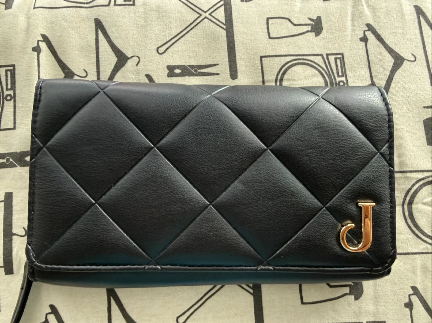 This black quilted wallet features a gold-tone "J" logo. It has multiple card slots, a clear ID window, and a zippered coin pocket. Plenty of space for your essentials!
