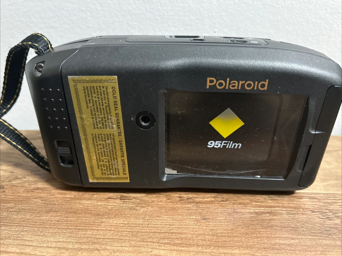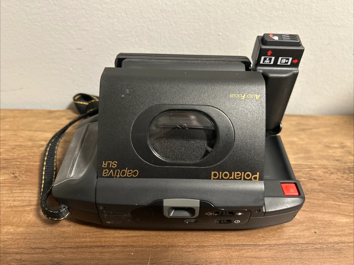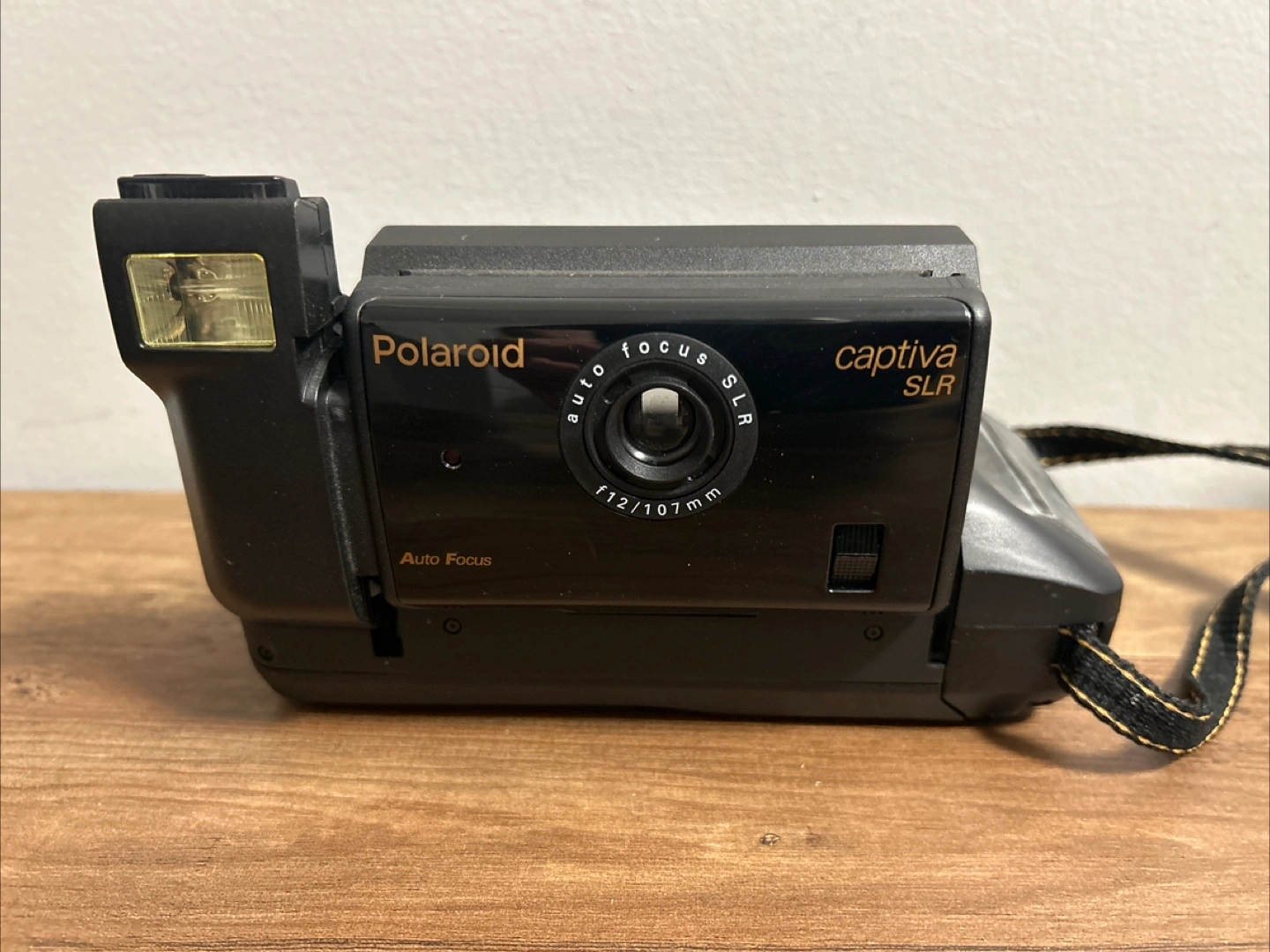 This Polaroid Captiva SLR camera features auto focus and a built-in flash. It uses 95 film. Includes a neck strap.