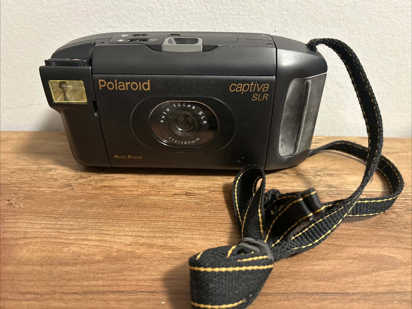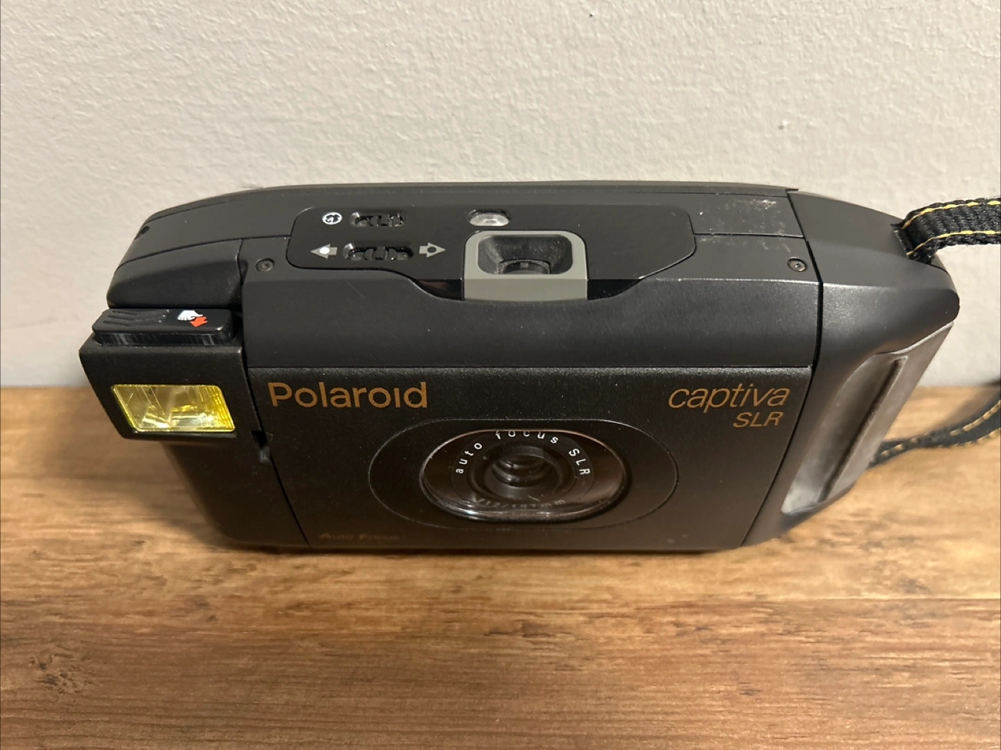 This Polaroid Captiva SLR camera features auto focus and a built-in flash. It uses 95 film. Includes a neck strap.