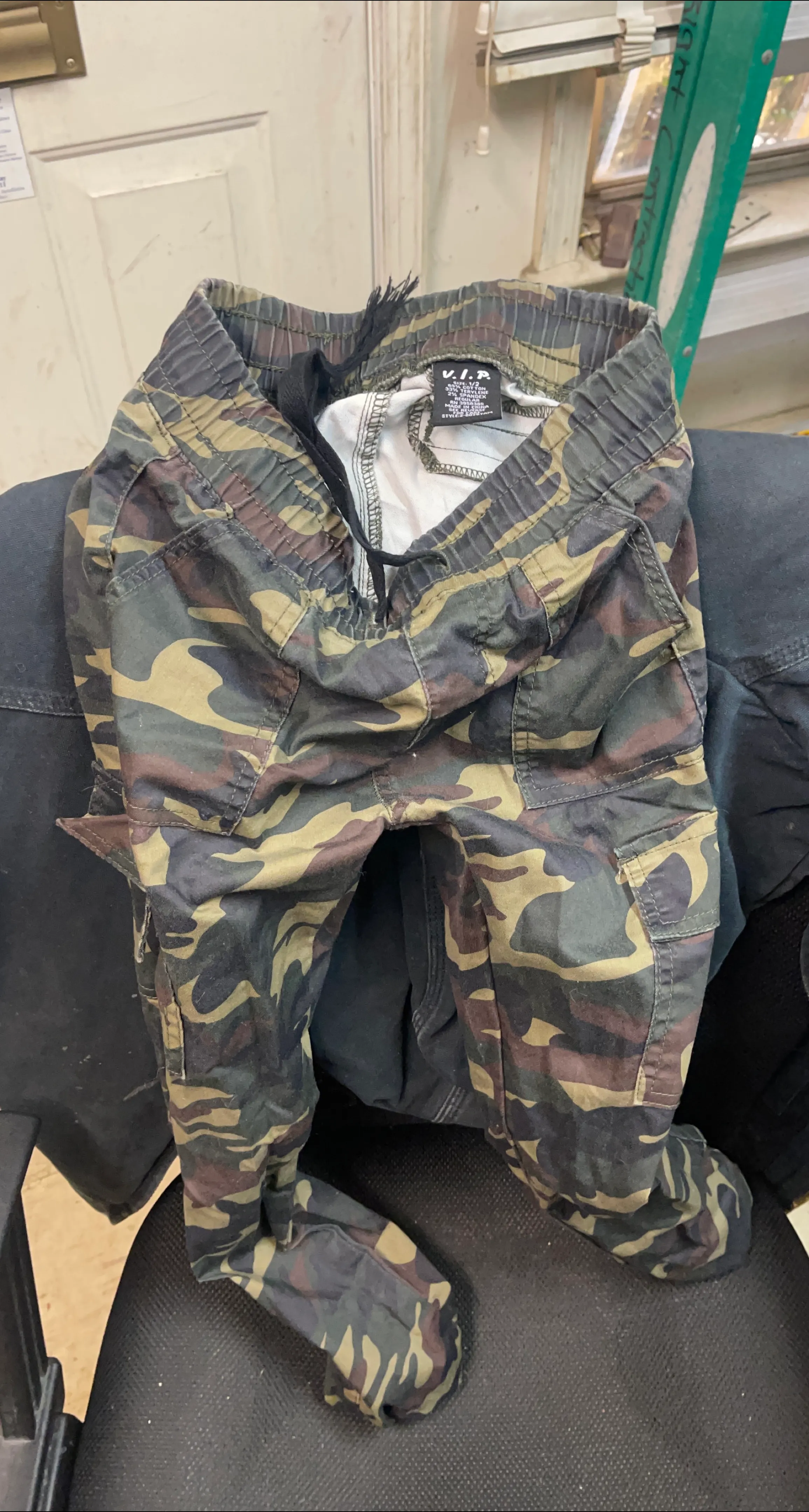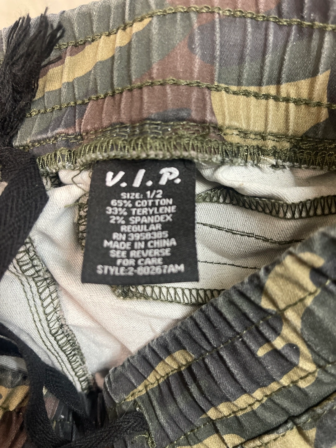 Selling a pair of V.I.P. camo jogger pants in size 1/2. They are made of 65% cotton, 33% terylene, and 2% spandex. The pants are regular fit and have a stylish camo pattern.