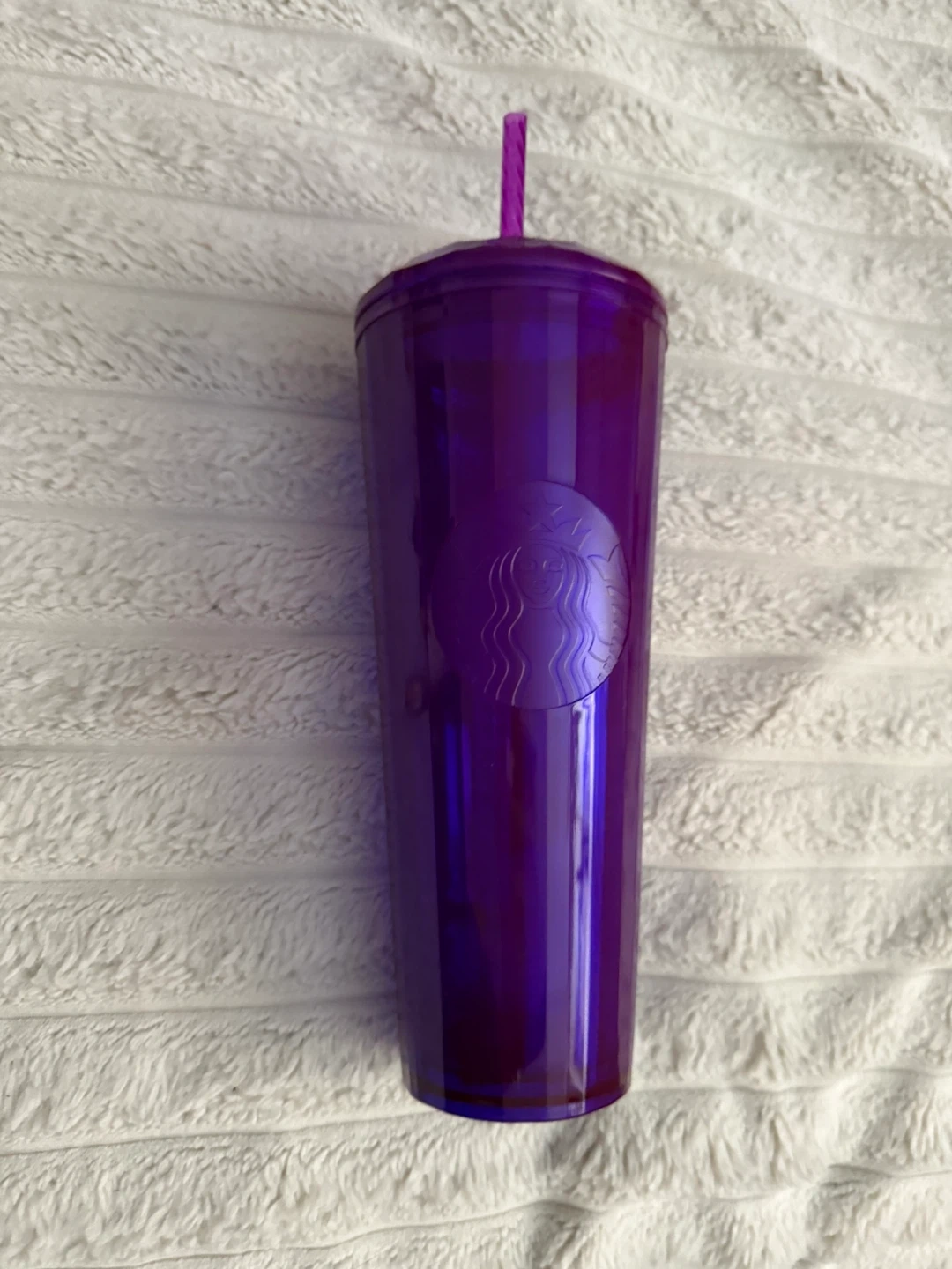 This is a Starbucks tumbler in a vibrant purple colour. It comes with a matching purple straw. It's made of plastic. Keep your drinks on the go!