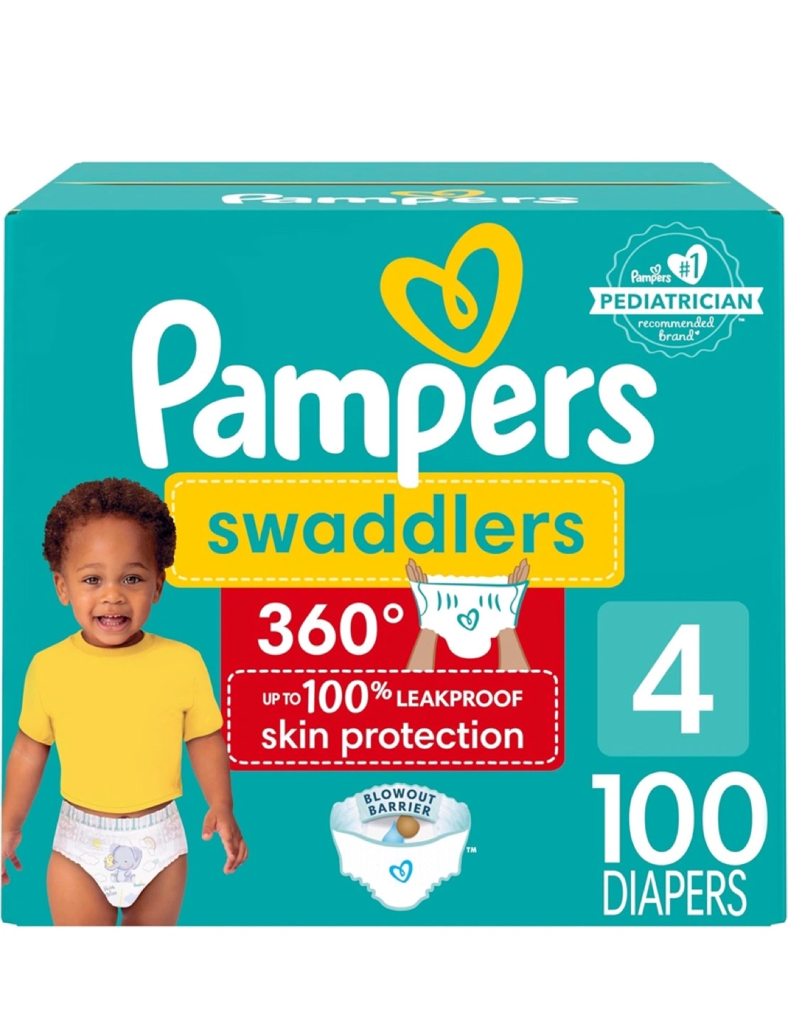 Pampers Swaddlers Size 4 diapers. 100 count. Up to 100% leakproof skin protection.